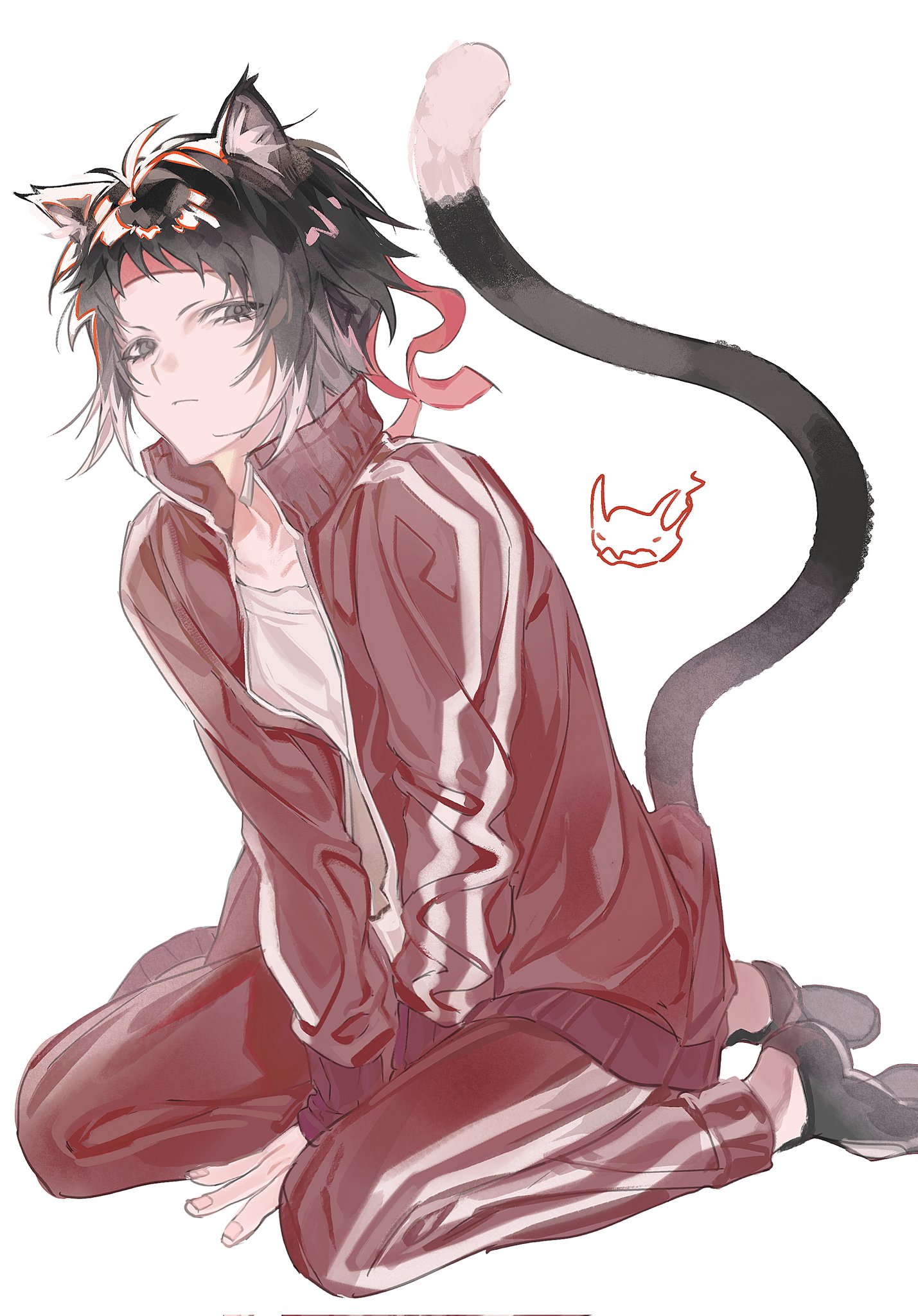 1boyalternate costumeanimal earsblack eyesblack haircat boycat earscat tailclosed mouthfull bodyfull-length zipperheadbandjacketlong sleeveslooking at viewermale focusmitabxd 7multicolored hairopen clothesopen jacketpantsred headbandred track suitshirtshort hairsimple backgroundsittingsolotailtrack jackettrack pantstrack suittwo-tone hairunzippedwarizawhite backgroundwhite hairwhite shirtzipperzipper pull tab