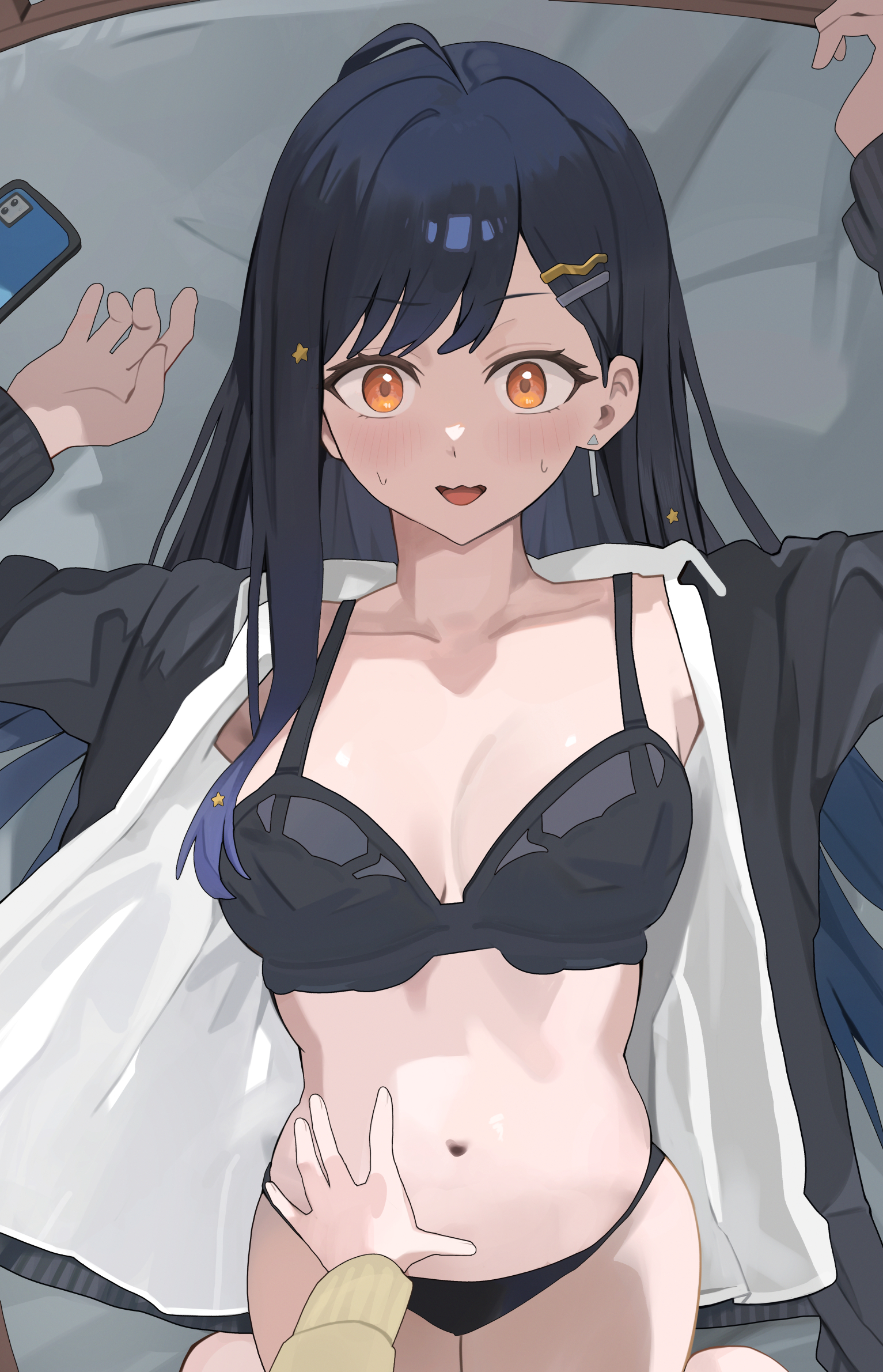 hui yu, irys (hololive), irys (maid) (hololive), hololive, hololive english, commentary, english commentary, highres, 1boy, 1girl, :d, anus, arm support, bar censor, bare legs, barefoot, bedroom, black skirt, blue eyes, blunt bangs, blush, breasts, breasts out, brooch, censored, chest bow, clothed female nude male, clothes pull, crystal wings, double halo, drill hair, erection, feet, footjob, footjob with legwear, frilled shirt, frilled skirt, frills, halo, hand up, hetero, heterochromia, high-waist skirt, horns, indoors, jewelry, lace-trimmed collar, lace trim, legs, looking at viewer, male pubic hair, medium hair, miniskirt, multicolored hair, nail polish, nipples, no panties, nude, official alternate costume, official alternate hairstyle, on bed, open mouth, penis, pink nails, pointy ears, pov, pov crotch, pubic hair, puffy short sleeves, puffy sleeves, purple eyes, purple hair, pussy, red hair, shirt, shirt pull, shirt tucked in, short sleeves, sitting, skirt, smile, solo focus, star-shaped pupils, star (symbol), star halo, streaked hair, symbol-shaped pupils, teeth, testicles, toe seam, toenail polish, toenails, toes, twin drills, twintails, two-footed footjob, upper teeth only, virtual youtuber, white shirt, wings