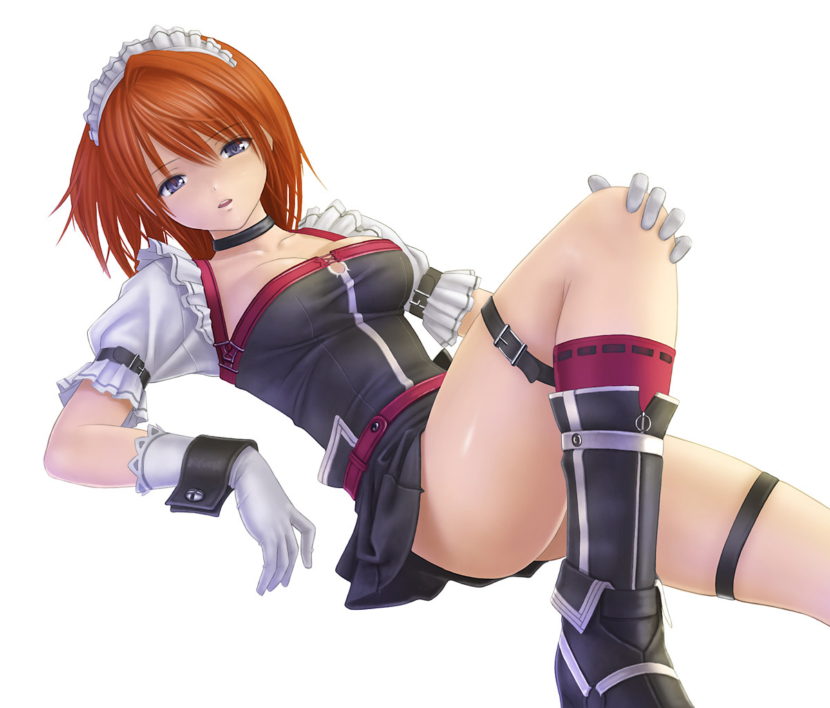 blue eyesbootsbucklechokergloveslyingmaidmaid headdressno pantiesopen mouthred hairshort hairsolostrapthigh strapwrist cuffs