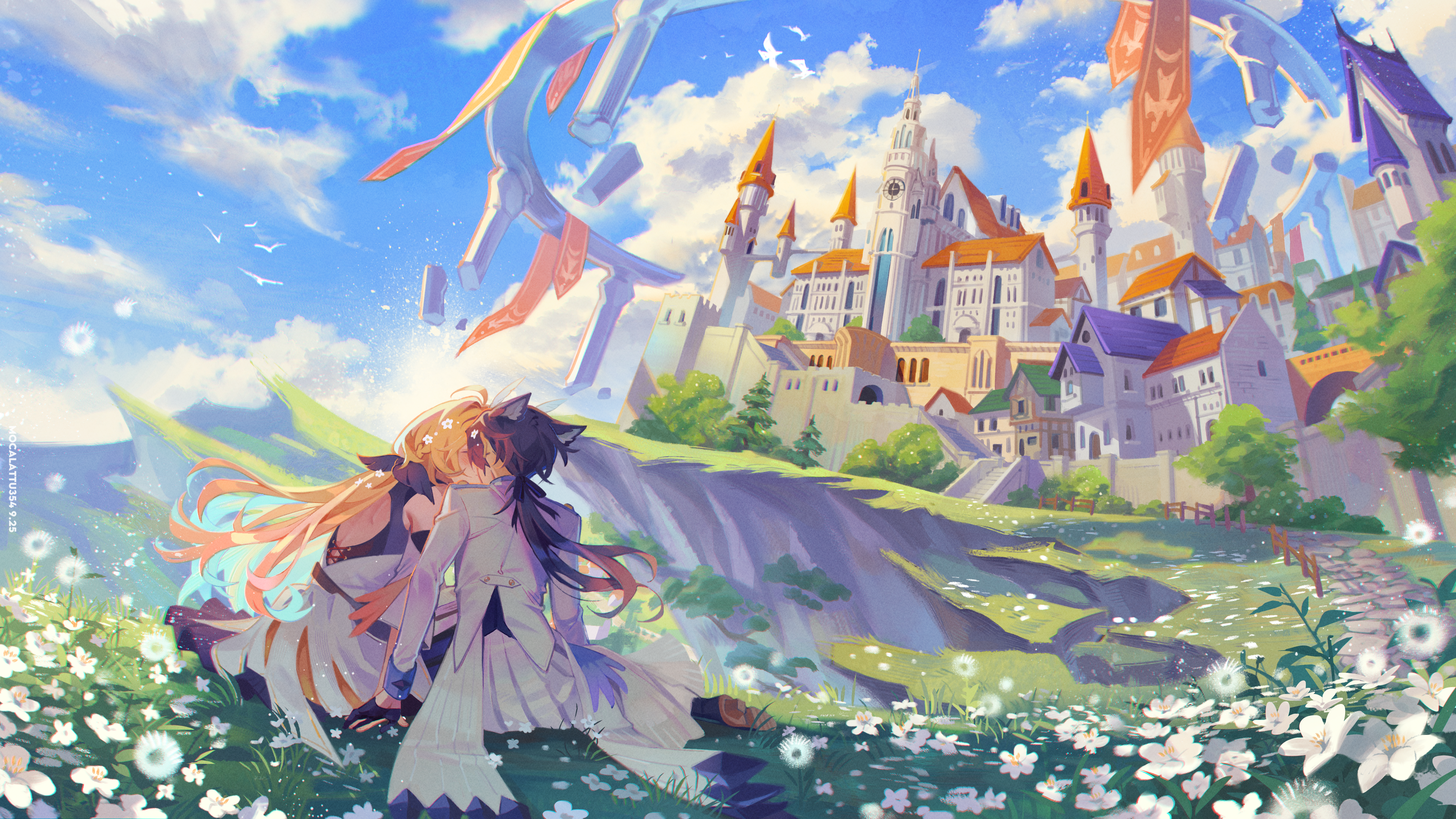 2girlsanimal earsbirdblack glovesblonde hairblue skyblushbuildingcastlecat earscliffcloudcoatdaydressfantasyflowerglovesgrasskisslong hairmeadowmultiple girlson groundoutdoorssittingskirtskytreewhite coatwhite dresswhite flowerwhite skirtyuri