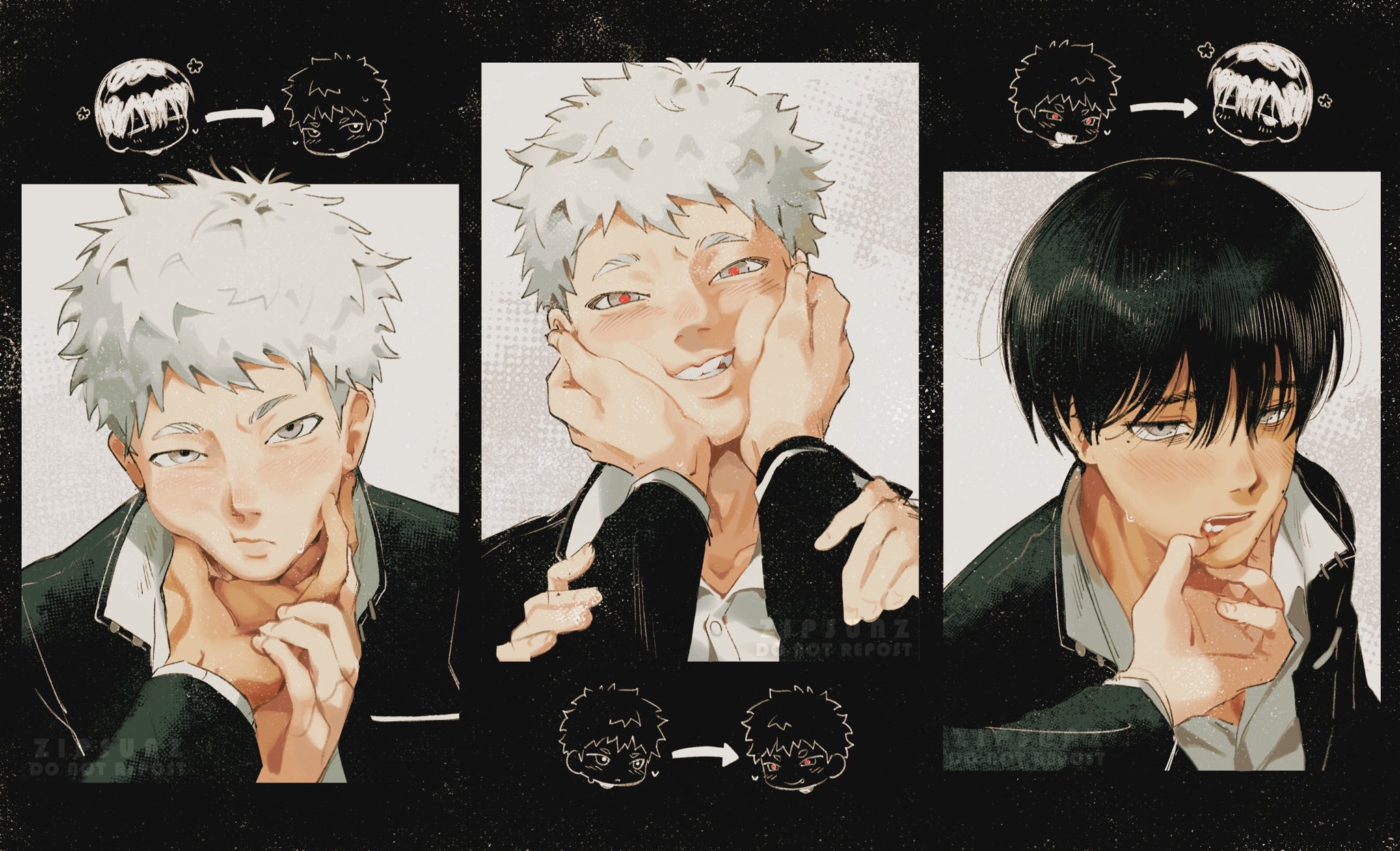3boysartist nameblack hairblushchibichibi insetclosed mouthcollared shirtfinger in another's mouthgakurangrey eyeshair between eyeshand on another's armhand on another's chinhands on another's cheekshands on another's facelipslooking at viewermale focusmolemole on cheekmole under eyemole under mouthmultiple boysmultiple molesred pupilsschool uniformshirtshort hairsweatteethupper bodywhite hairwhite shirtyaoi