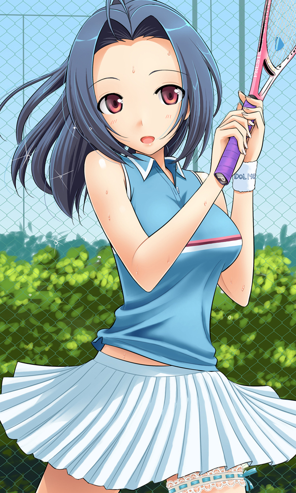 00sahogeblue hairlong hairpleated skirtracketred eyesskirtsolosweatbandtennistennis racketwristband