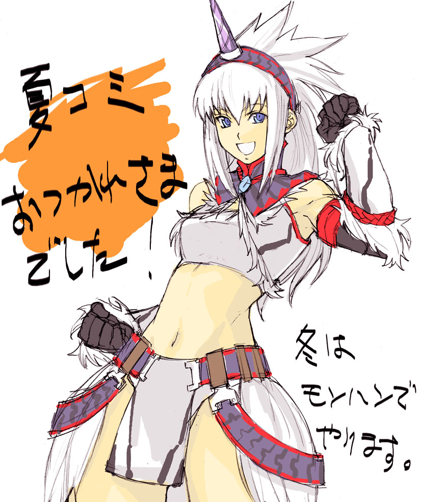1girlblue eyesfemale focusgloveshairbandhornskirin (armor)midriffsingle hornsmilesolowhite hair
