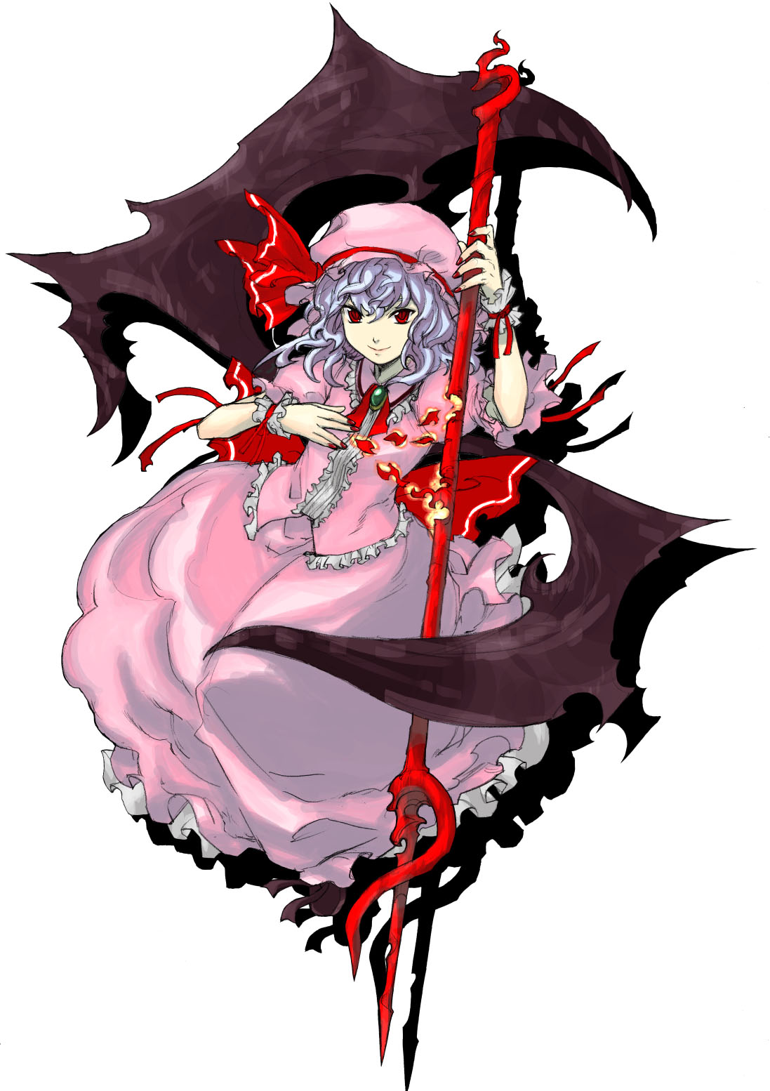 1girlbonnetcurly hairdressfemale focushatlong hairpolearmred eyessmilesolospearspear the gungnirweaponwings