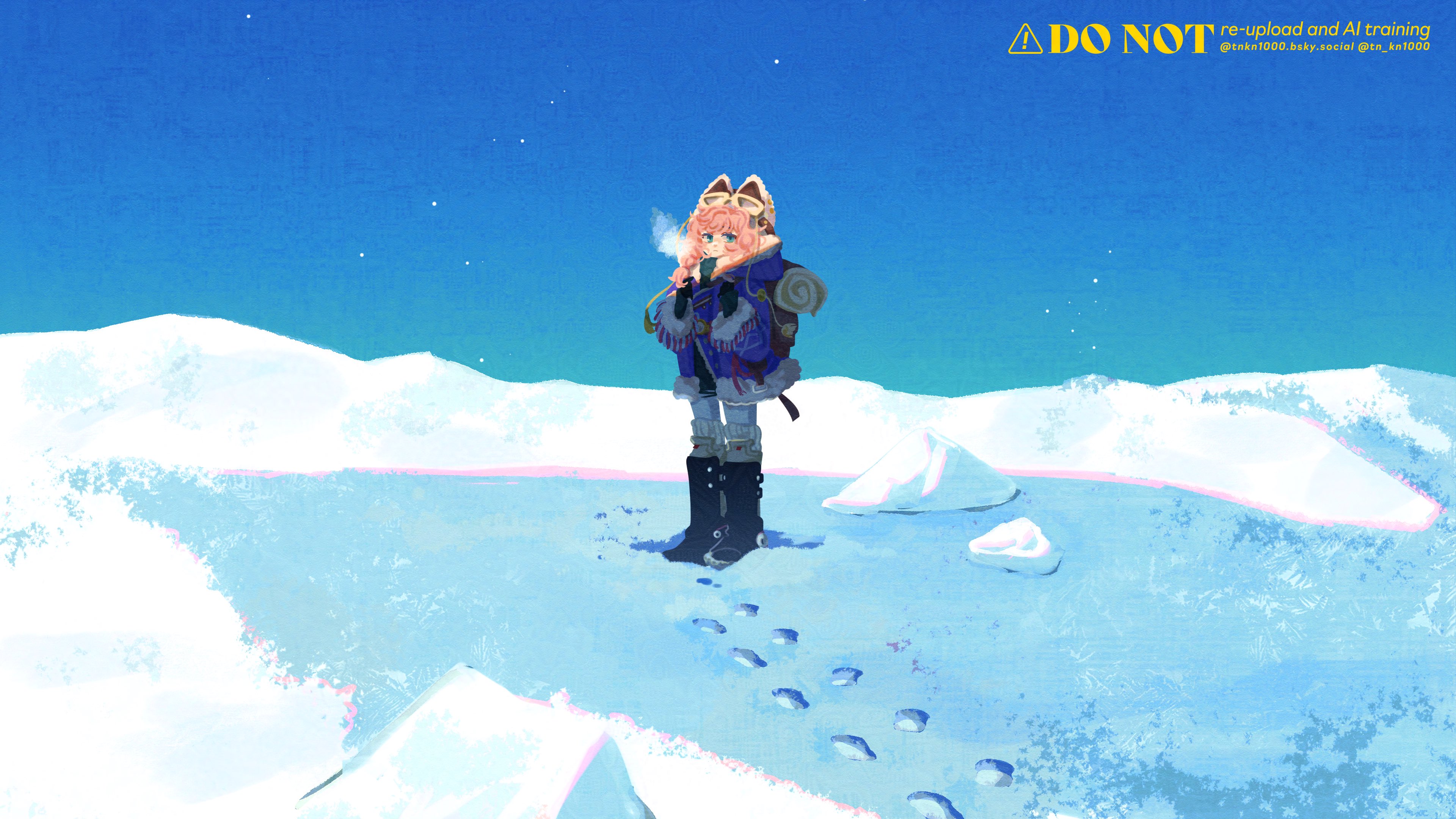 1girlbackpackbagblack bootsblack glovesblue eyesblue skybootsbreathbrown hatclosed mouthcoatdaydot mouthfootprintsfull bodyglovesgogglesgoggles on headhands uphatlong hairoutdoorspantspink hairpurple coatshadeskysnowsolostandingtrapper hatwhite pantswide shot