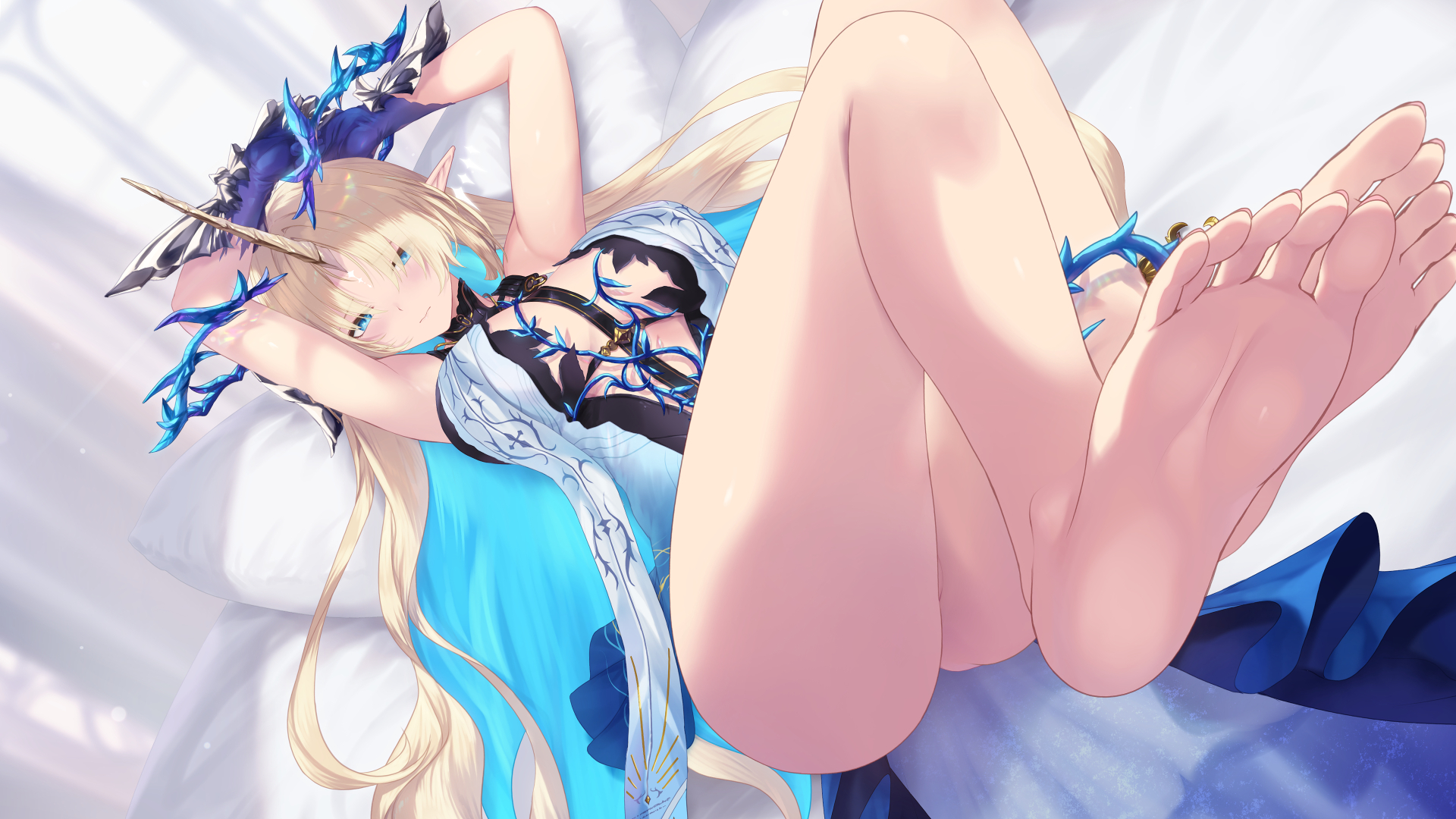 1girladapted costumebare legsbare shouldersbarefootbedblack leotardblonde hairblue eyesblue hairblue handsblushbreastscleavageclosed mouthcolored inner haircrown of thornsearringsfeetfloating earringshornsjewelrylarge breastslegsleotardlong hairlong hornslooking at viewerlyingmulticolored hairon backon bedpointy earssingle hornsolessolotabardtacet mark (wuthering waves)thighstoesvery long hairwhite tabardyellow horns