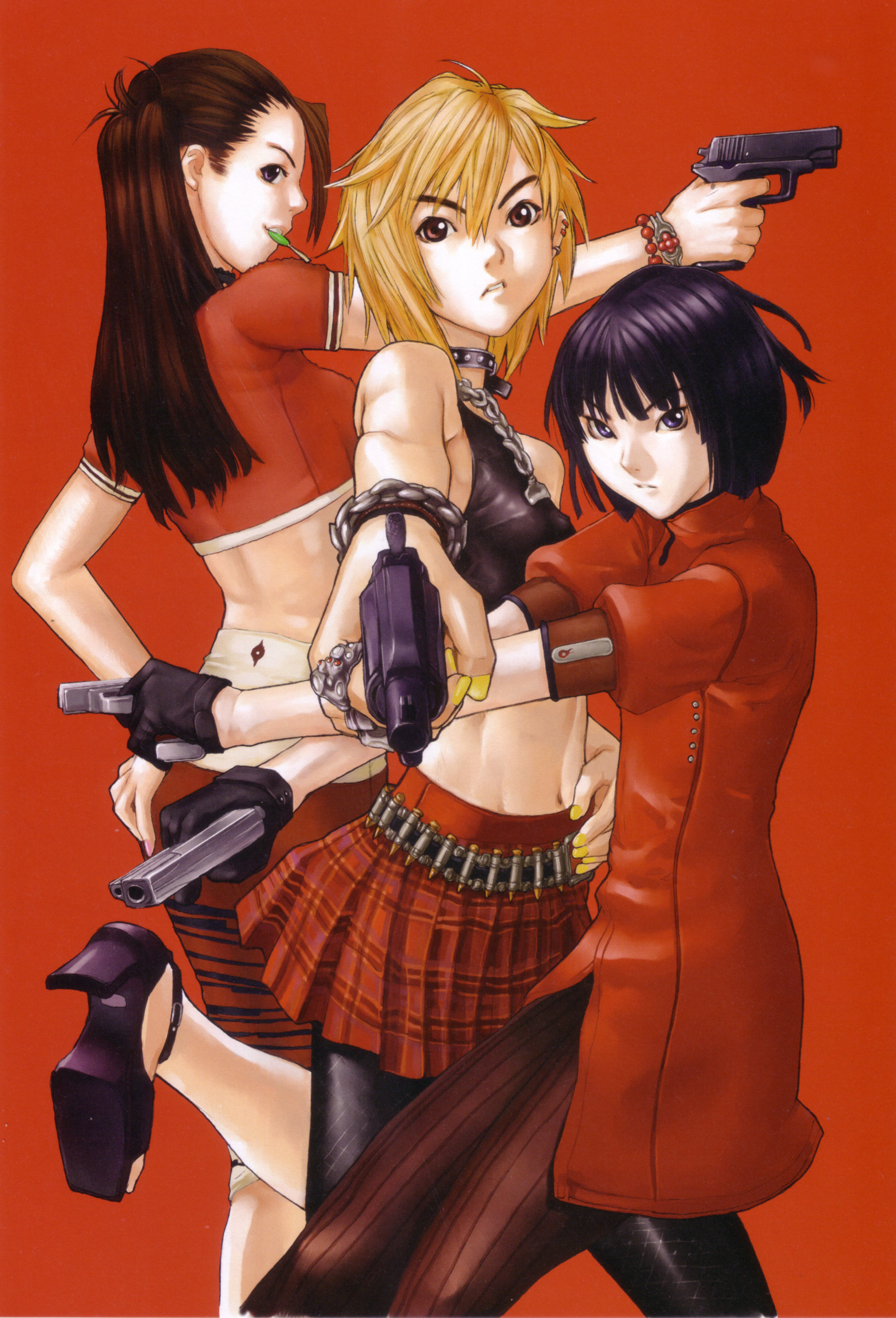 3girlsabsassbackbare shouldersbeadsbeltblack hairblonde hairblue eyesblunt bangsbob cutbraceletbrown eyesbrown hairbulletcandychaincollarcrop topcrossed armsdual wieldingearringsfighting stanceflat chestfoodforeshorteningfrom behindgrabbing own flat chestgunhand on own hiphandgunhigh heelsholdingjewelryleatherleg liftlollipoplong hairlooking at viewerlooking backmidriffminiskirtmouth holdmultiple girlsnavelnecklaceoutstretched armoutstretched armspantspantyhosepistolplaid clothesplaid skirtpleated skirtprofilerevolverringsandalsshoesshort hairsimple backgroundskirtstandingstudded collartank topturtleneckweapon