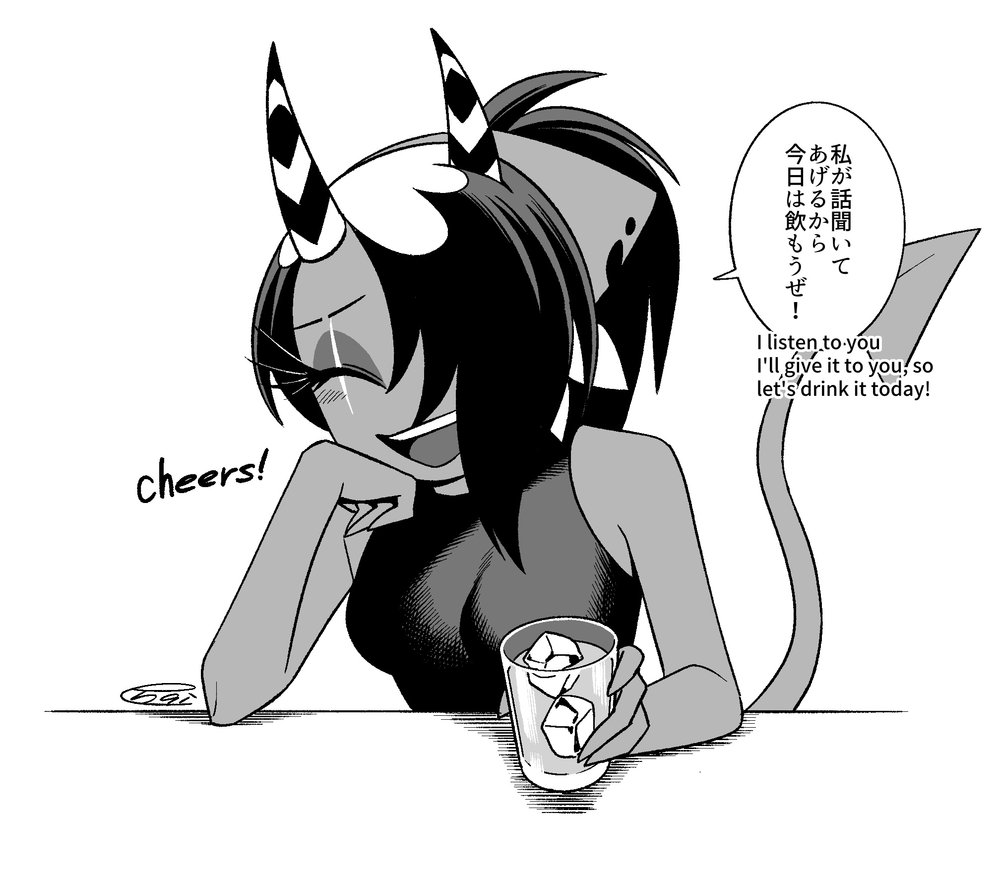:d1girlbare armsbare shouldersbilingual textbreastscupdemon girldemon hornsdemon tailelbows on tableenglish texteyeshadowfacing viewerfewer digitsgreyscalehair over one eyehand on own cheekhand on own facehatching (texture)headscarfhigh ponytailholdingholding cuphornsiceice cubelong hairmakeupmixed-language textmonochromemulticolored hairmulticolored hornsone eye coveredopen mouthponytailraised inner eyebrowsroots (hair)scarscar across eyescar on faceshirtsignaturesimple backgroundsleevelesssleeveless shirtsmall breastssmilesolostriped hornstabletailteethtonguetwo-tone hairtwo-tone hornsupper bodyupper teeth onlywhite background