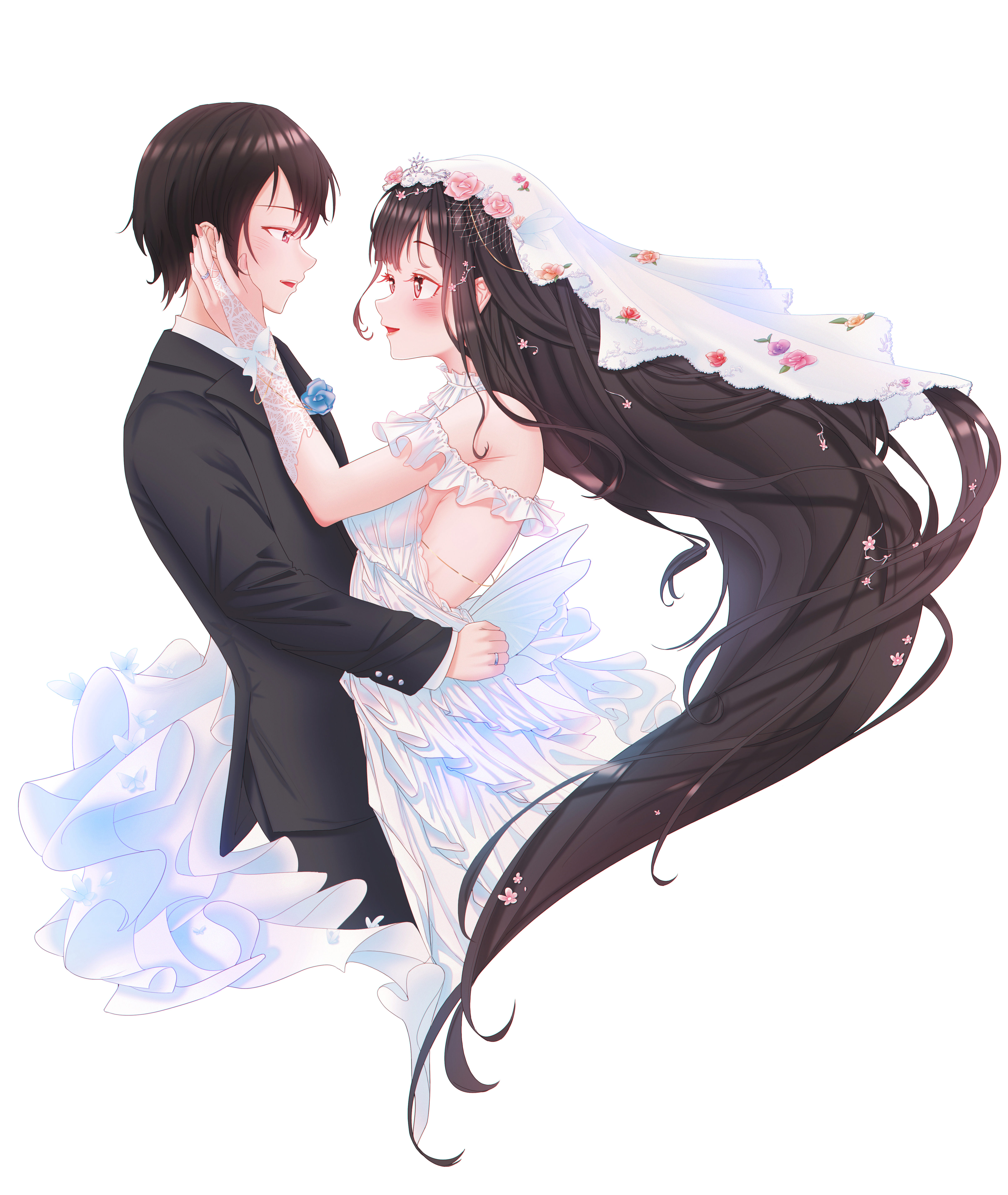 1boy1girlblack hairblack suitblushbreastsbridal gauntletsbridal veilcropped legsdresseye contactfloating hairflowerformal clothesgloveshair flowerhair ornamentheterohughusband and wifelacelace gloveslong hairlooking at anothersideboobsimple backgroundsmilestraight hairsuitveilvery long hairwedding dresswhite backgroundwhite dresswhite gloves