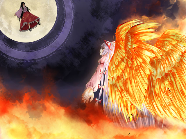 2girlsblack hairclouddressfemale focusfiery wingsfirehair ribbonlong hairmoonmultiple girlsnightred eyesribbonrivalryshirtshoesskirtskyvery long hairwhite shirtwings