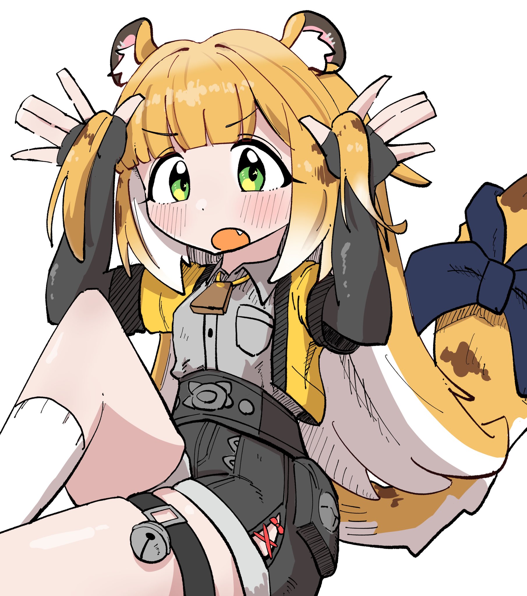1girlanimal ear fluffanimal earsblonde hairglovesgreen eyeslong hairlooking at viewermulticolored hairopen mouthshirtsmilesolotailtiger earstiger girltiger tailwhite hair
