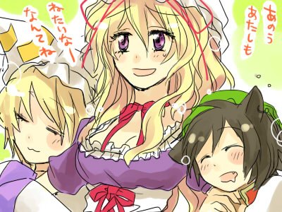 andou mahoro, cyberdoll may, multi (to heart), hand maid may, mahoromatic, to heart, to heart (series), 00s, 3girls, blue hair, brown hair, green eyes, green hair, maid, multiple girls, school uniform, serafuku, thighhighs