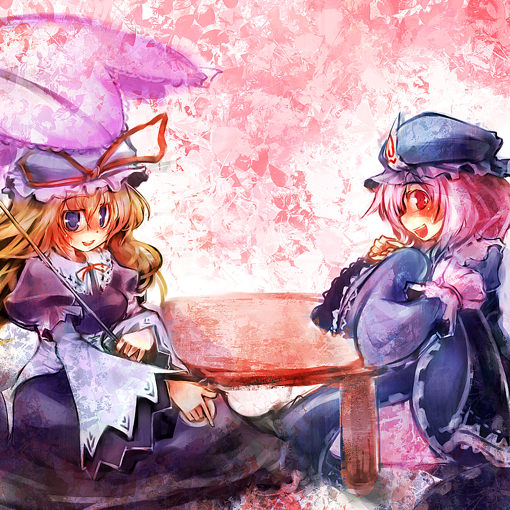 2girlsblonde hairblue eyesblushfemale focushathat ribbonjapanese clotheskimonolong hairmultiple girlsopen mouthparasolpink hairred eyesribbonshort hairsmiletableumbrellawide sleeves