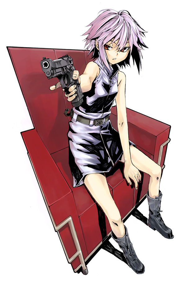 1girlberetta 92bootsfemale focusflat chestforeshorteninggunhandgunholdingholding gunholding weaponorange eyespink hairpistolshort hairsittingsolotrigger disciplineweapon