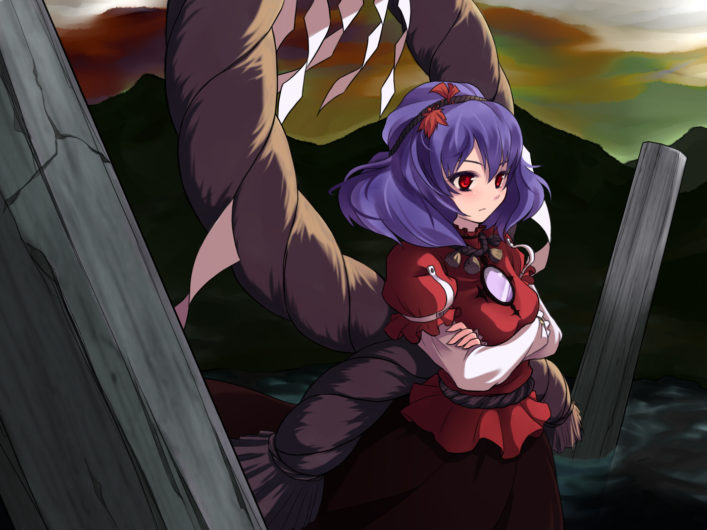 1girlfemale focushair ornamentleafleaf hair ornamentonbashirapurple hairropeseriousshideshimenawashort hairsolothinking