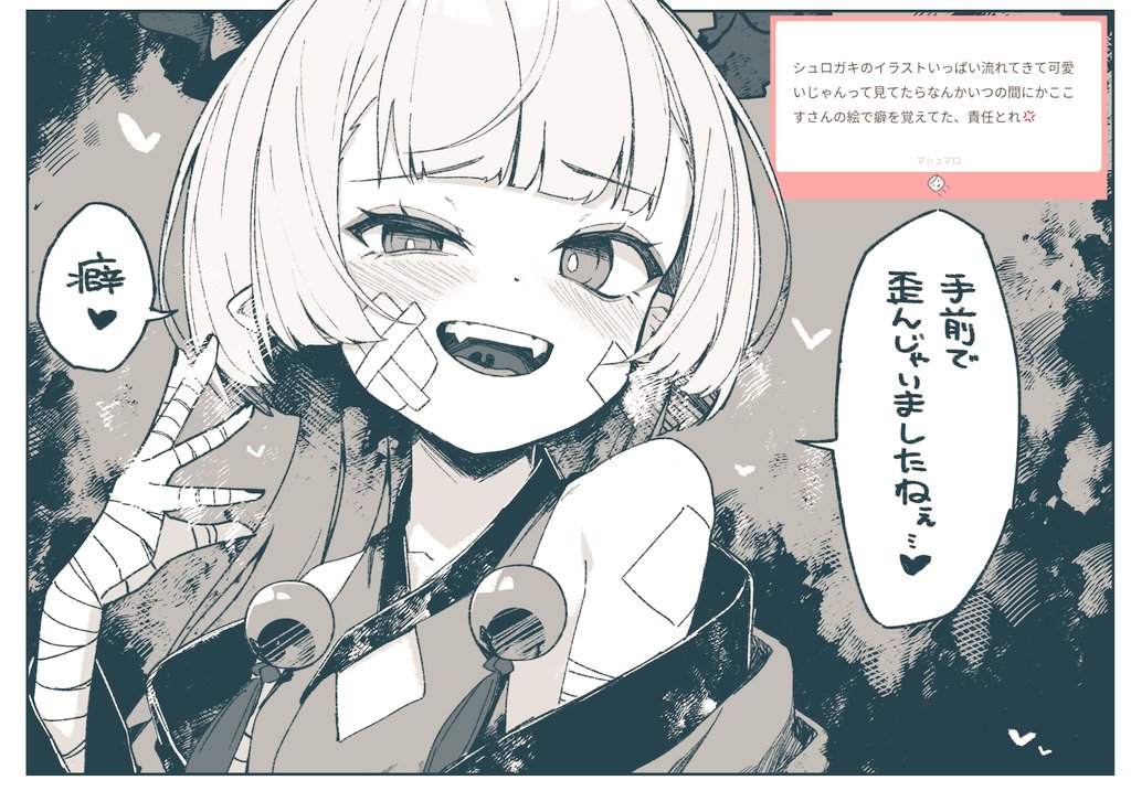 1girlbare shouldersblushfangflat chestgauzegauze on armgauze on facegrey hairgreyscalehaloheartlooking at viewermonochromepale skinseductive smilesmilespeech bubblesteaming body