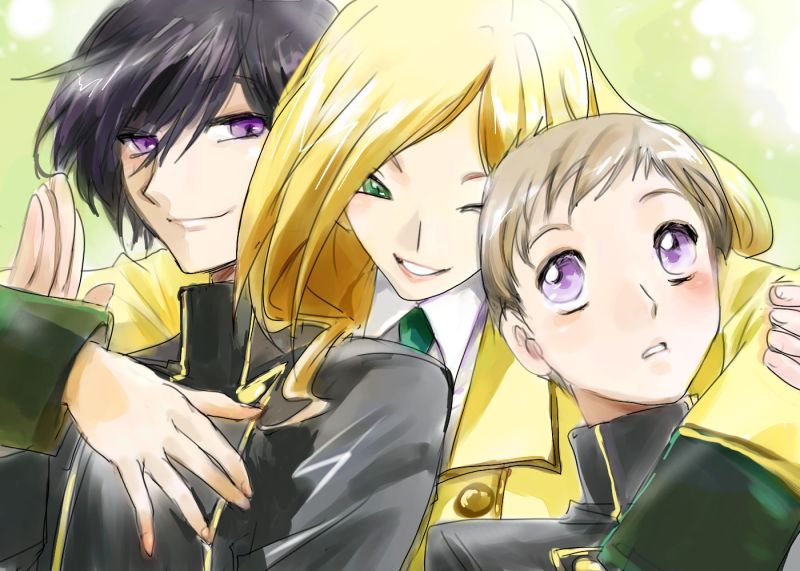 :o00s1girl2boysblack hairblonde hairblushbrothersbuttonscollarhugmilitarymilitary uniformmultiple boysparted lipspurple eyessiblingsupper body