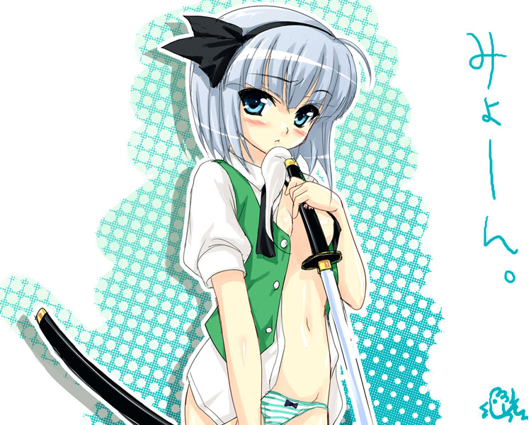 1boy1girlblue eyesblushfemale focushair ribbonhairbandkatanaopen clothesopen shirtpantiesribbonschool uniformserafukushirtshort hairsolostriped clothesstriped pantiesswordunderwearweapon