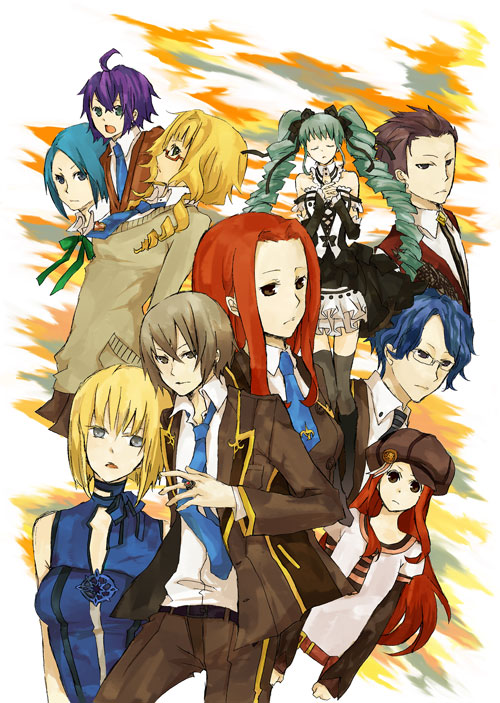 4boys6+girlsahogebeltblonde hairblue necktiebucklecollared shirtcowboy shoteveryoneexpressionlessformal clothesgreen eyesgreen hairhead tiltlong sleeveslooking at viewermultiple boysmultiple girlsnecktiepantspurple hairred hairshirtstandingsuittwintailswhite shirt
