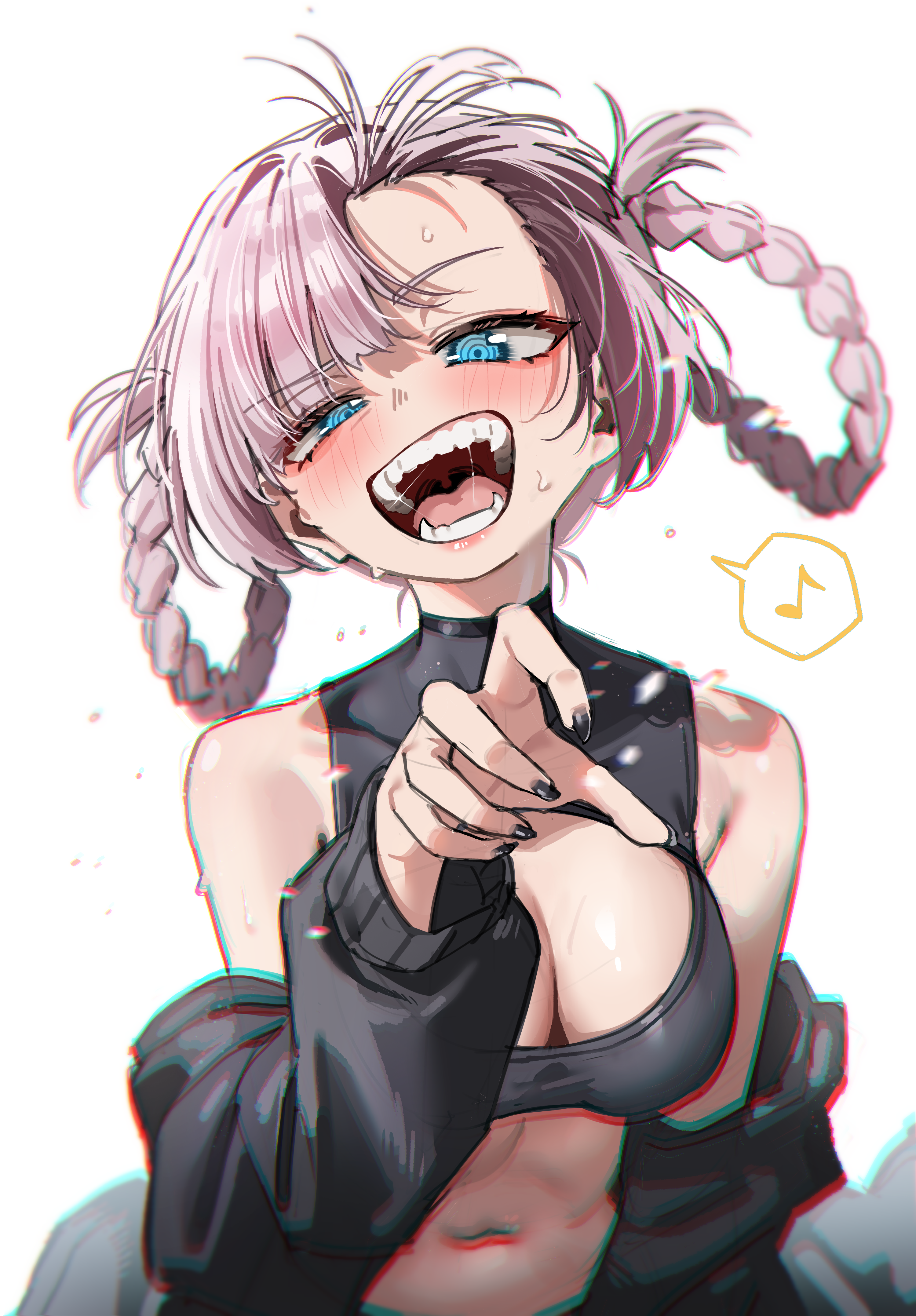 1girlblack jacketblack nailsblue eyesbreastscleavagefangsfingernailsjacketlooking at viewermedium breastsmusical notenail polishopen mouthpink hairsalivashort hairsimple backgroundsolospoken musical noteteethwhite background