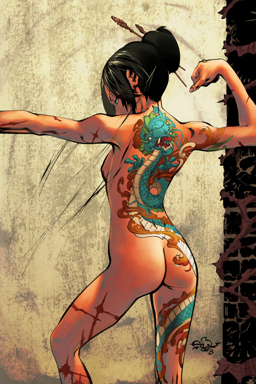 1girlassbackback tattooblack hairblue eyesdragonfemale focusfull-body tattoohair bunnudeshort hairsingle hair bunsolostandingtattoo