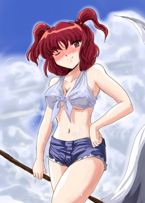 1girldenimdenim shortsfemale focusone eye closedred eyesred hairscytheshirtshort hairshortssolot-shirttwintailstwo side upwetwink
