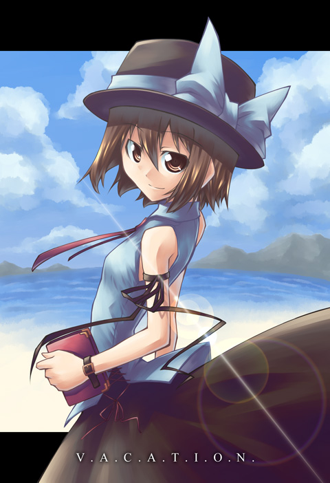 1girladapted costumebare shouldersbeachblack skirtbookbrown eyesbrown hairdayfedorafemale focushathorizonletterboxedlooking at vieweroutdoorssandskirtsolostandingwater
