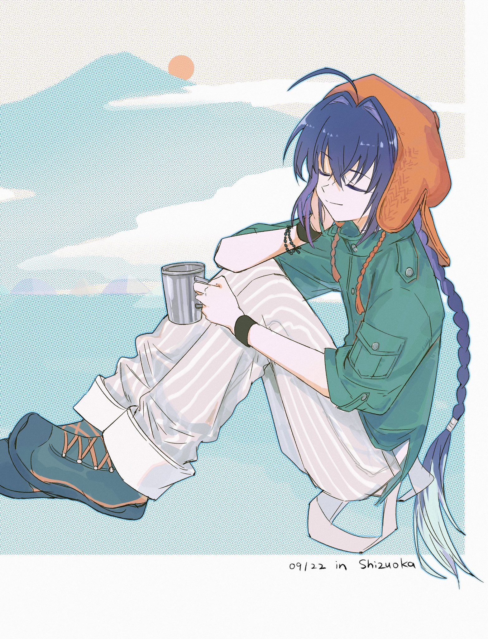 1otherahogebeanieblack hairbraceletbraidbraided ponytailclosed eyescupearflap beaniefull bodygreen shirthair intakeshatholdingholding cupjewelrylong hairmountainmulticolored hairorange hatother focuspantsshirtshoessingle braidsmilestriped clothesstriped pantssunsweatbandtwo-tone hairvertical-striped clothesvertical-striped pantswhite hair