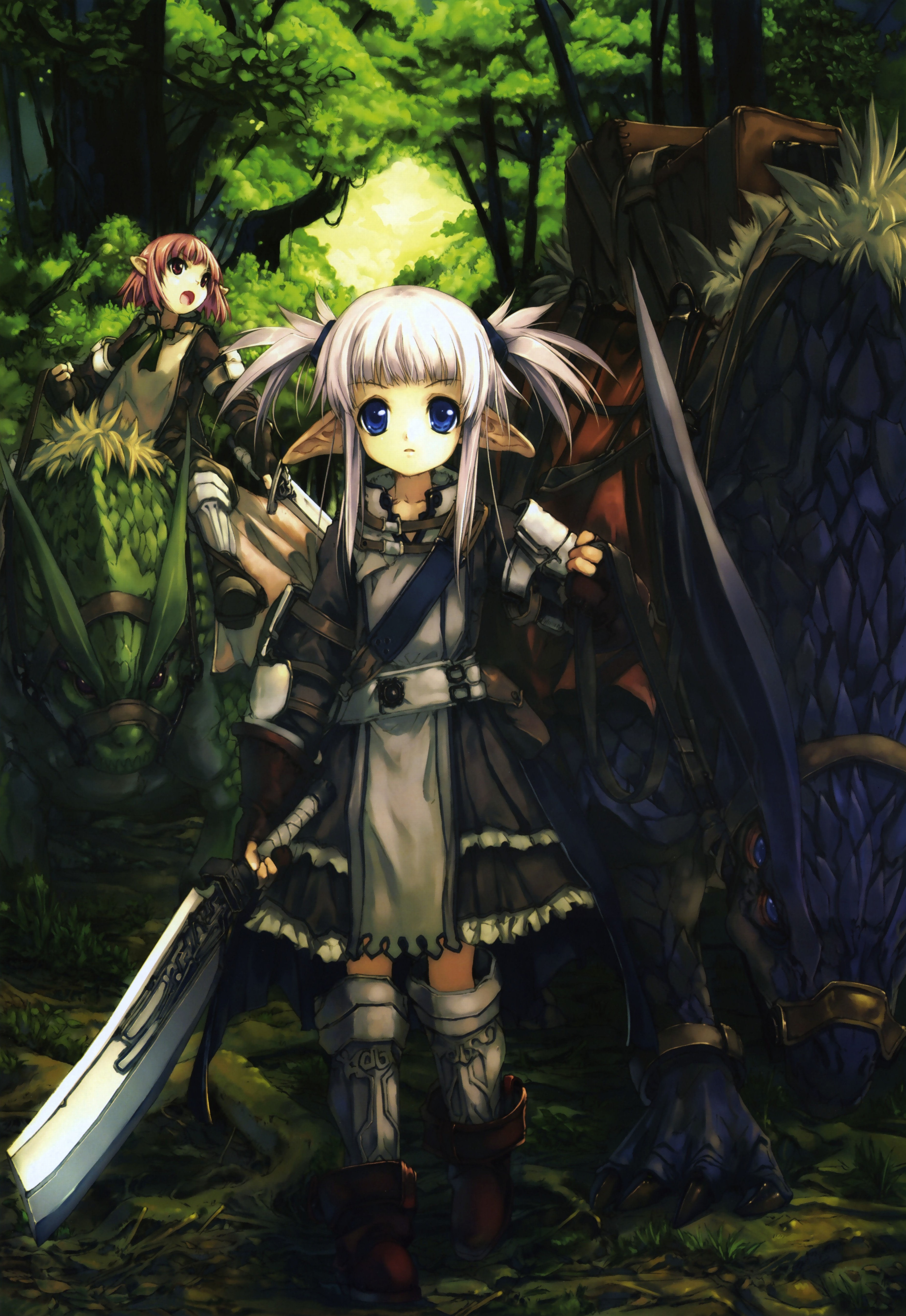 2girlsarmorblue eyeselffantasyforestmonstermultiple girlsnaturepointy earsred eyesred hairridingshort hairswordweapon