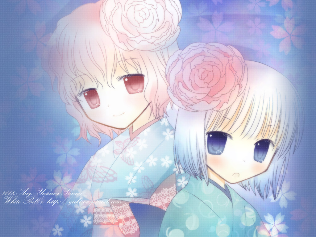 2girlsblue eyesblue hairfemale focusflowergradient backgroundhair flowerhair ornamentjapanese clotheskimonomultiple girlspink hairplantred eyesshort hairupper bodyyukata