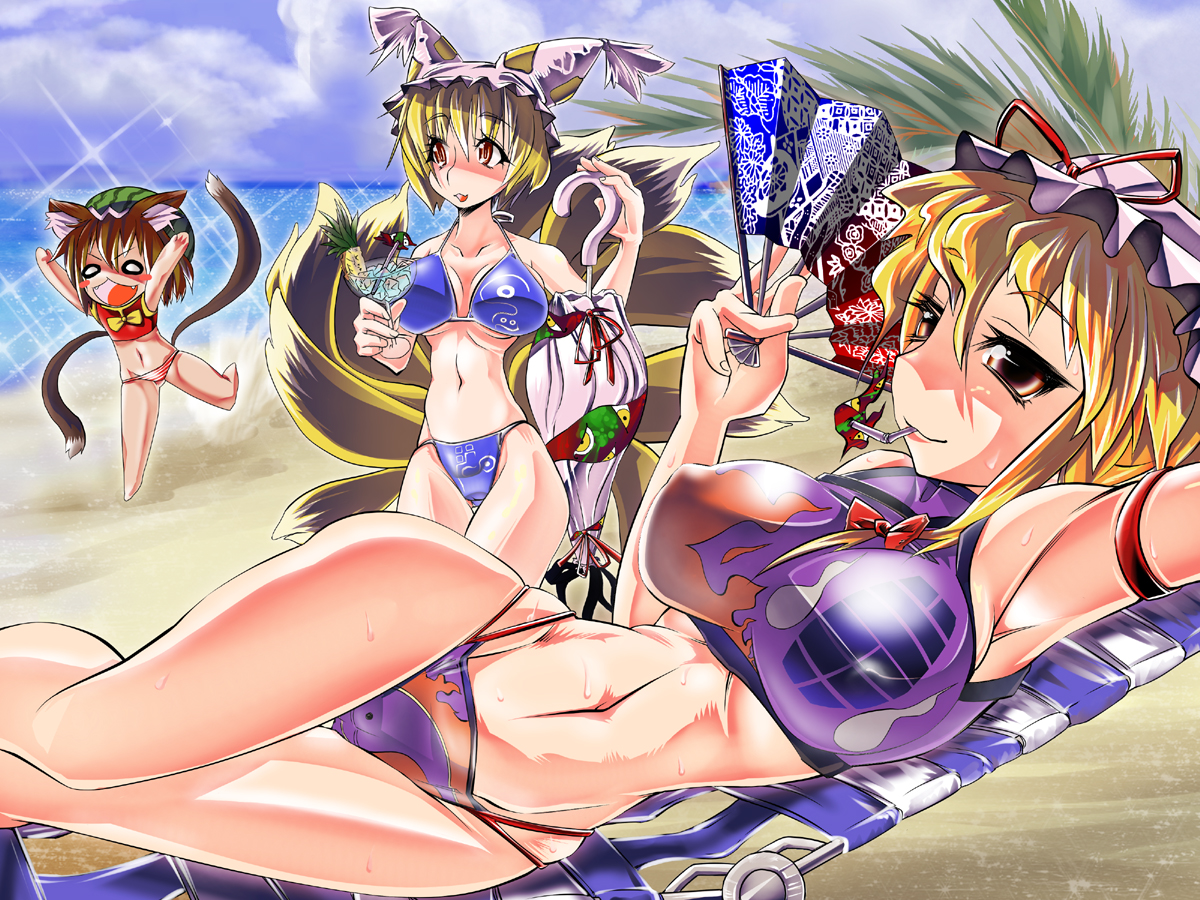 3girlsbikiniblonde hairbreastsfemale focusfolding fanhand fanhuge breastsmultiple girlsnarrow waistswimsuitumbrellawide hips