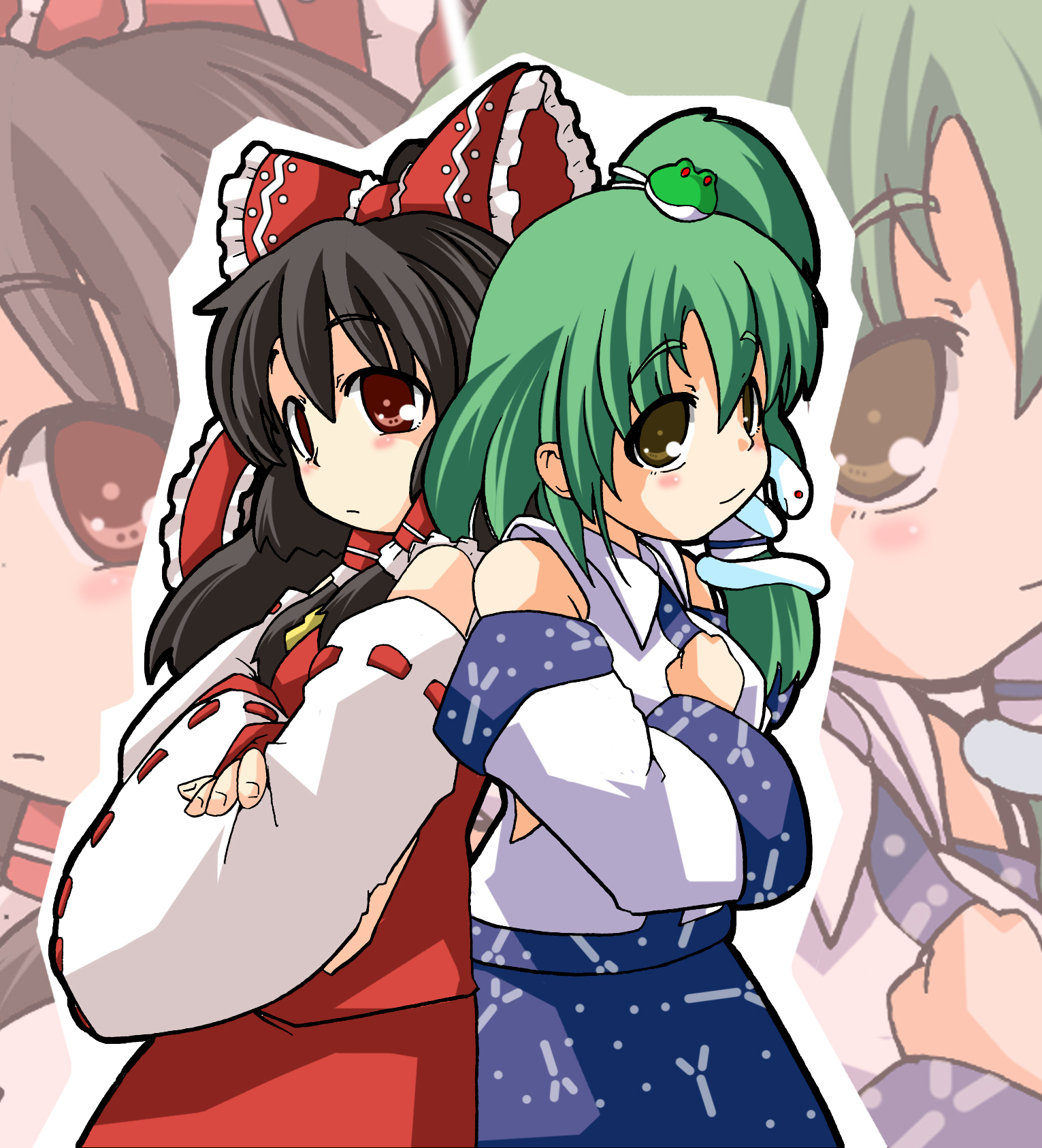 2girlsback-to-backblack hairdetached sleevesfemale focusgreen hairjapanese clothesmikomultiple girlsred eyesside ponytailzoom layer