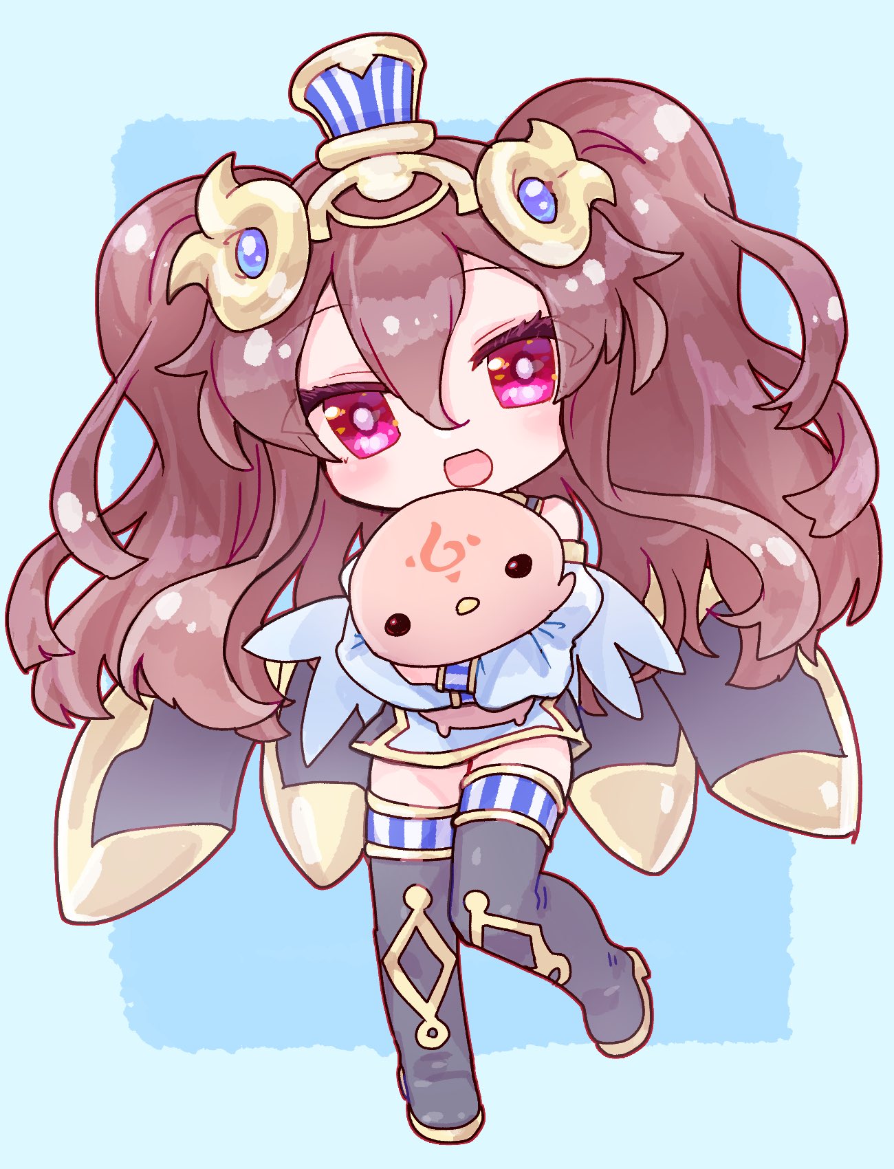 1girlanimalbaby animalbirdblack bootsblonde hairblue backgroundblue dressblue sleevesbootschibichickdetached sleevesdressholdingholding animalopen mouthpink eyessolostandingstanding on one legthigh bootstiaratwintails