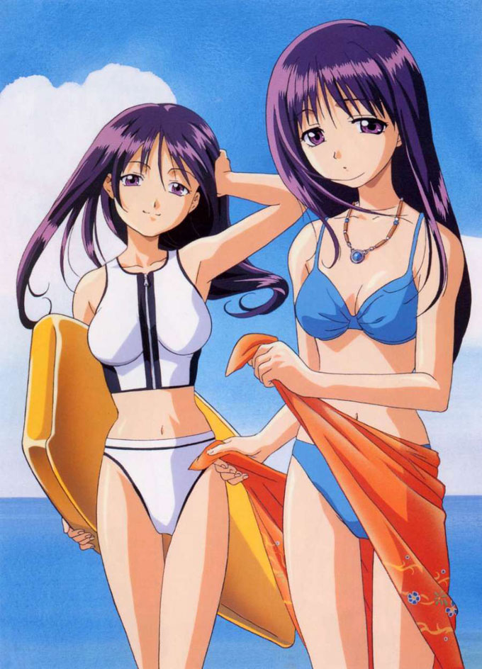 2girlsbeachbikiniclouddayjewelrylong hairmultiple girlsnecklaceoutdoorspurple hairsiblingssistersskysurfboardswimsuittwins