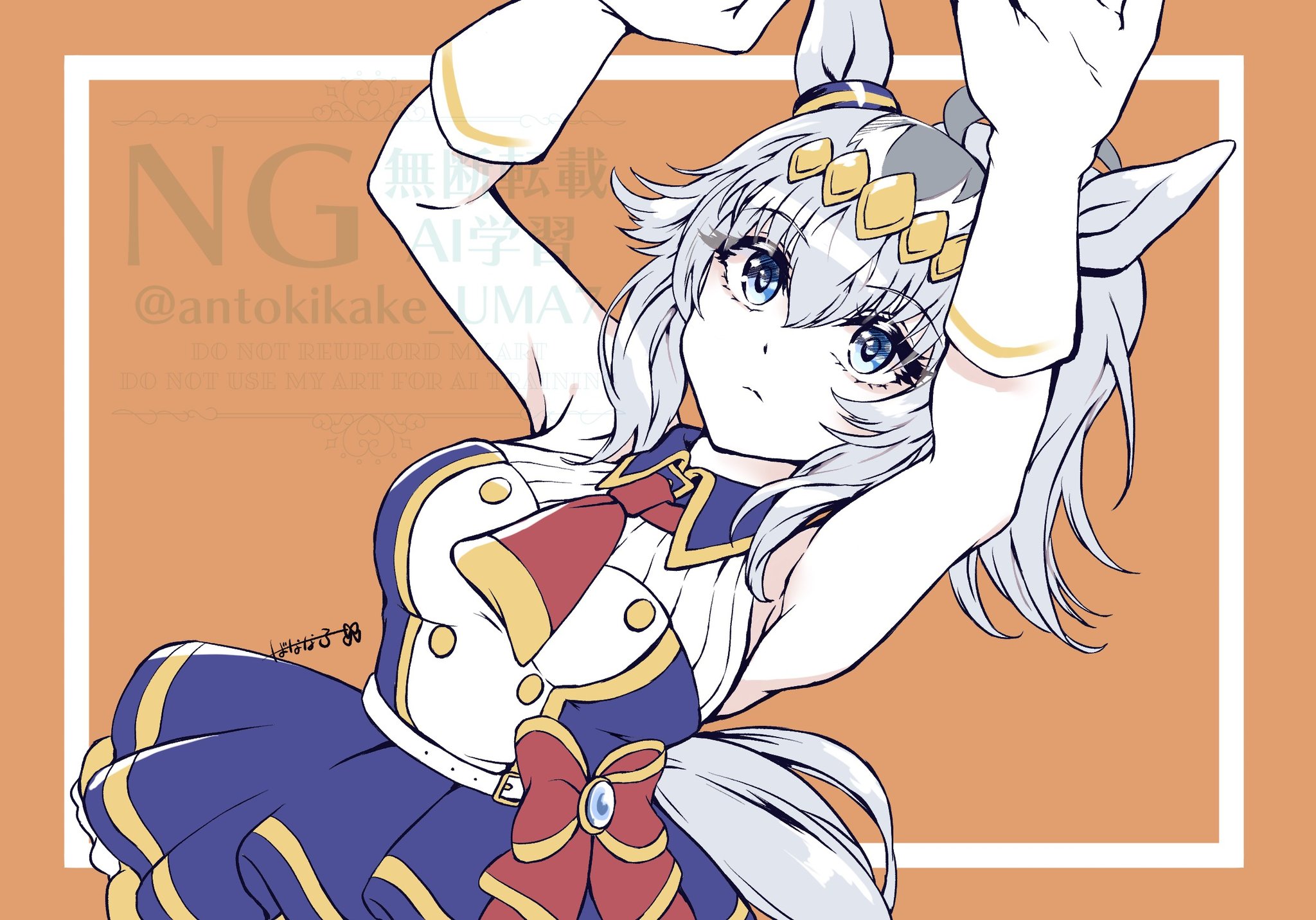 1girlahogeanimal earsantokikake uma7blue eyesear ornamentgrey hairgrey tailhair between eyeshair ornamenthairbandhorse earshorse girlhorse tailmulticolored hairsailor collarsailor shirtschool uniformshirtskirtsolotail
