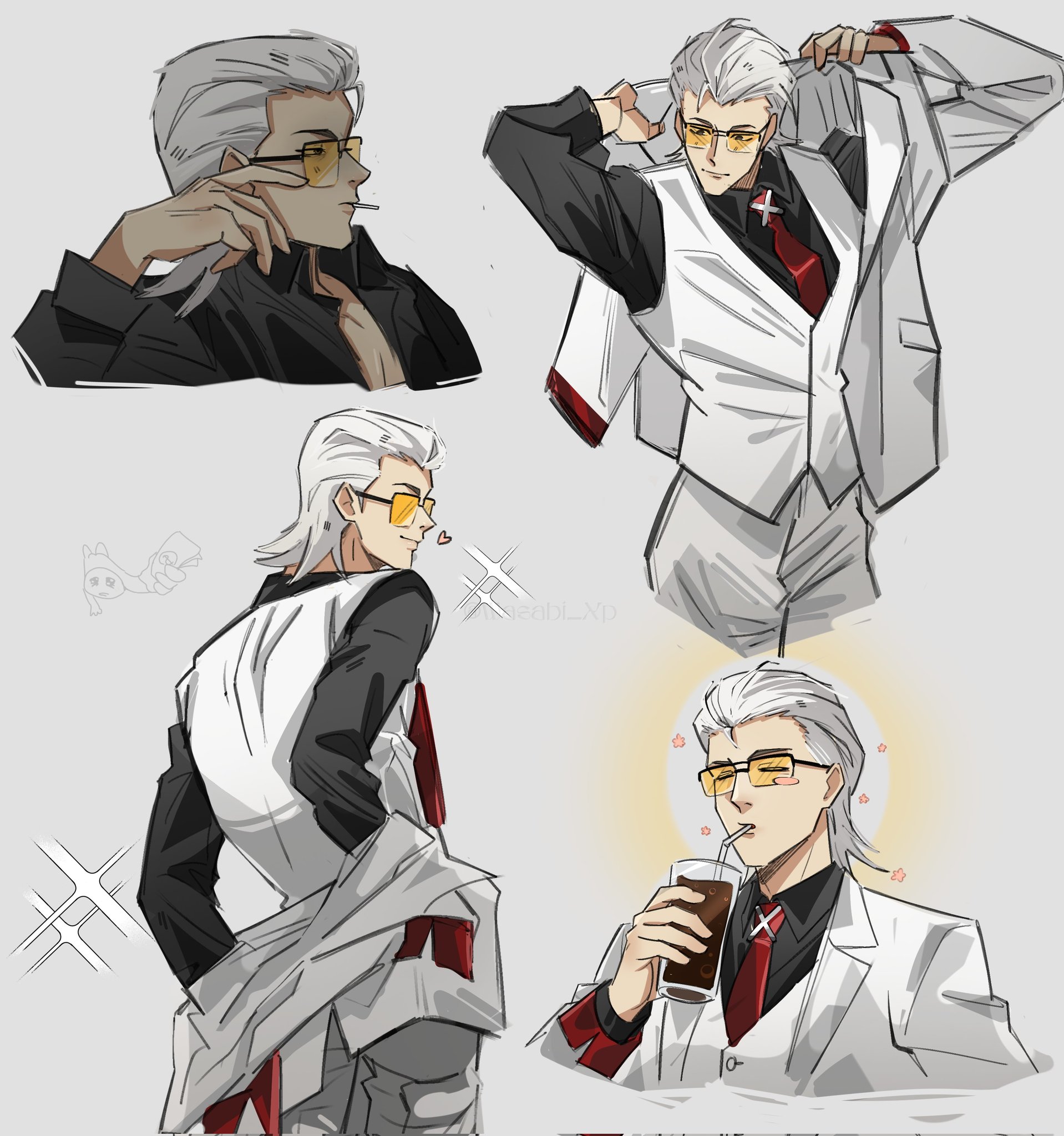 1boyblack eyesblack shirtcoatcoat partially removedhair slicked backmale focusmulletmultiple viewsnecktiered necktieshirtsparklesun behind headtinted eyewearvestwaasabi xpwhite backgroundwhite coatwhite hairwhite vestx (symbol)yellow-tinted eyewear
