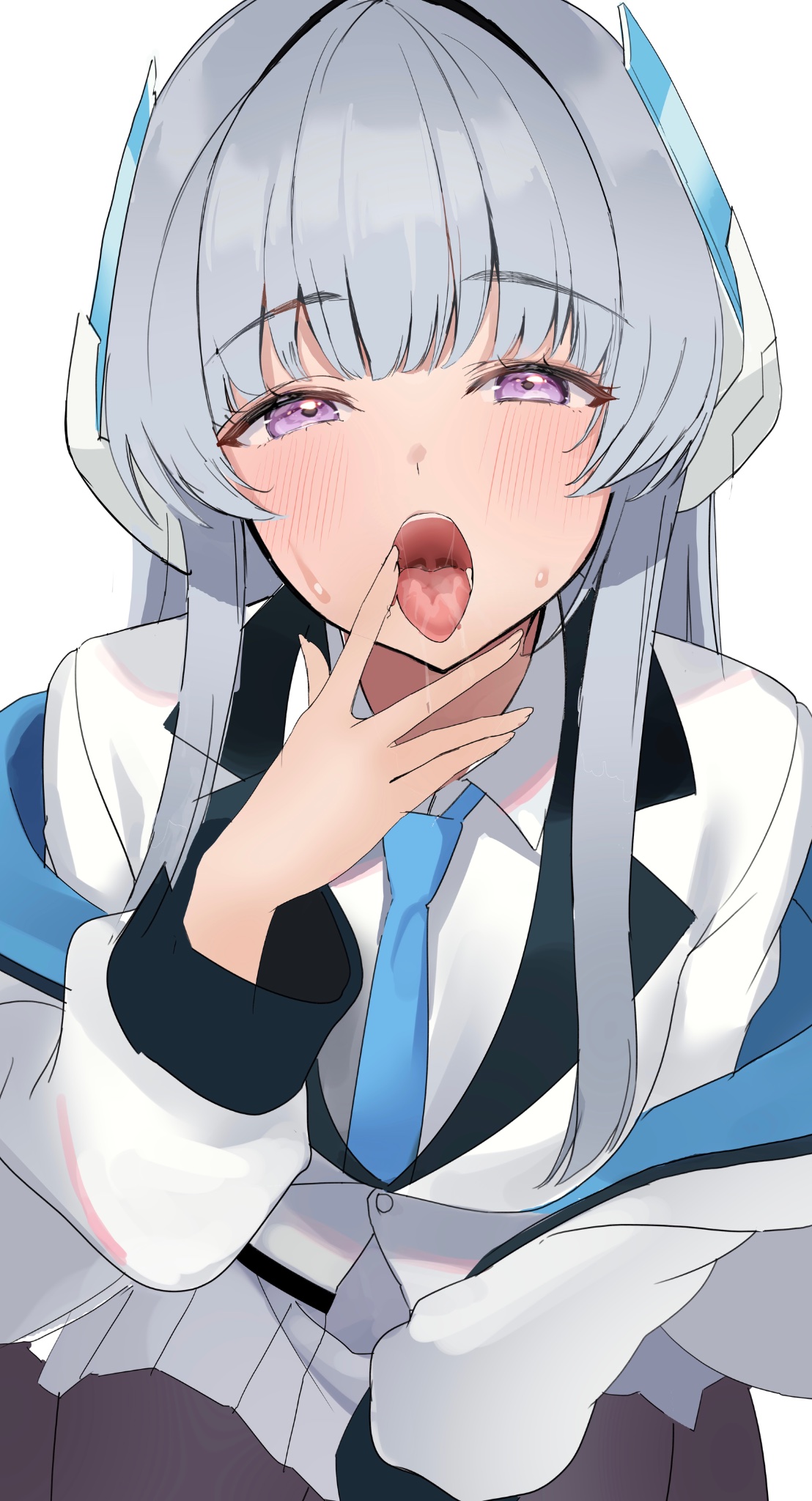 1girlblack pantyhoseblue necktieblushbreastsfinger to mouthgrey hairhaloheadgearjacketlarge breastslong hairlong sleeveslooking at viewermechanical halonecktieopen mouthoral invitationpantyhosepurple eyessalivashirtsimple backgroundsittingskirtsolosweattonguewarizawhite backgroundwhite shirtwhite skirt