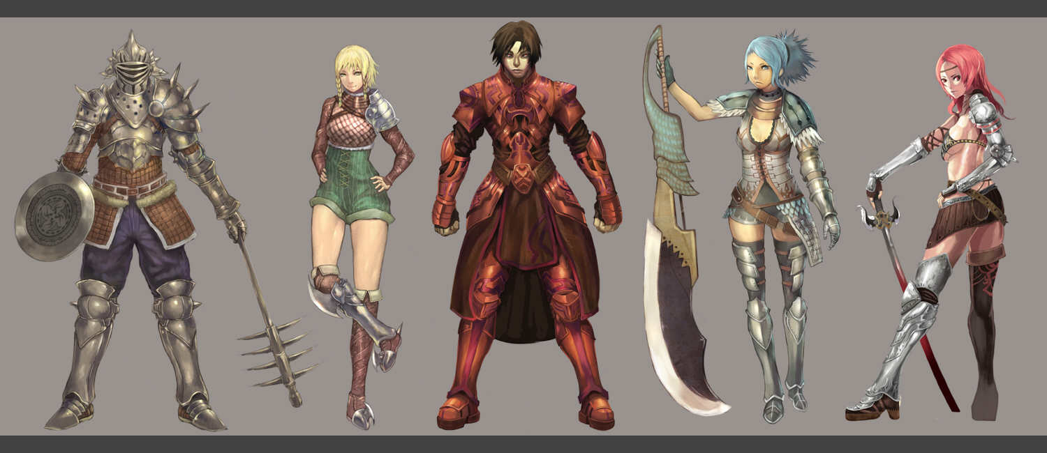 2boys3girlsarmorblonde hairblue eyesblue hairbrown hairmultiple boysmultiple girlsred eyesred hairswordweapon