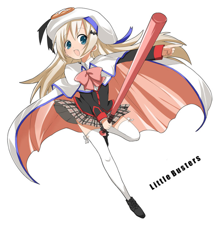 1girlbaseball batbat (animal)beretblonde hairblue eyesbowcapefangfemale focushair ornamenthaircliphatleg liftlong hairpink bowplaid clothesplaid skirtpointingschool uniformserafukuskirtsolothighhighswhite thighhighswindwind liftzettai ryouiki