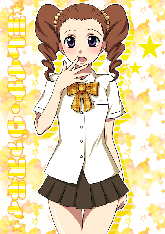 :o00s1girlblushbowbowtiebrown hairdrill hairembarrassedfemale focusflat chesthair ornamenthand over mouthhand to own mouthpleated skirtpurple eyesschool uniformserafukuskirtsolostandingstar (symbol)surprisedthigh gapthighstwin drillstwintails