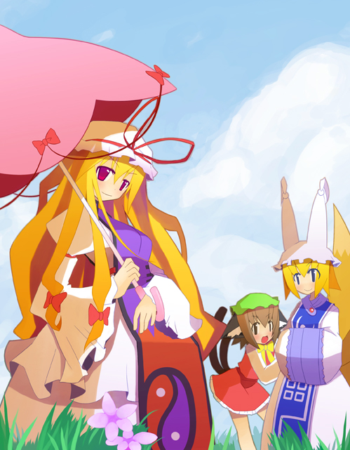 3girlsanimal earsanimal hatblonde hairblue skycat earscat girlcat tailclouddayfemale focusflowerfox earsfox tailfrom behindgrasshatlong hairlong sleeveslooking at viewerlooking backmob capmultiple girlsmultiple tailsnekomataoutdoorsribbonshort hairskystandingtabardtailtasseltwo tailsumbrellawide sleeves