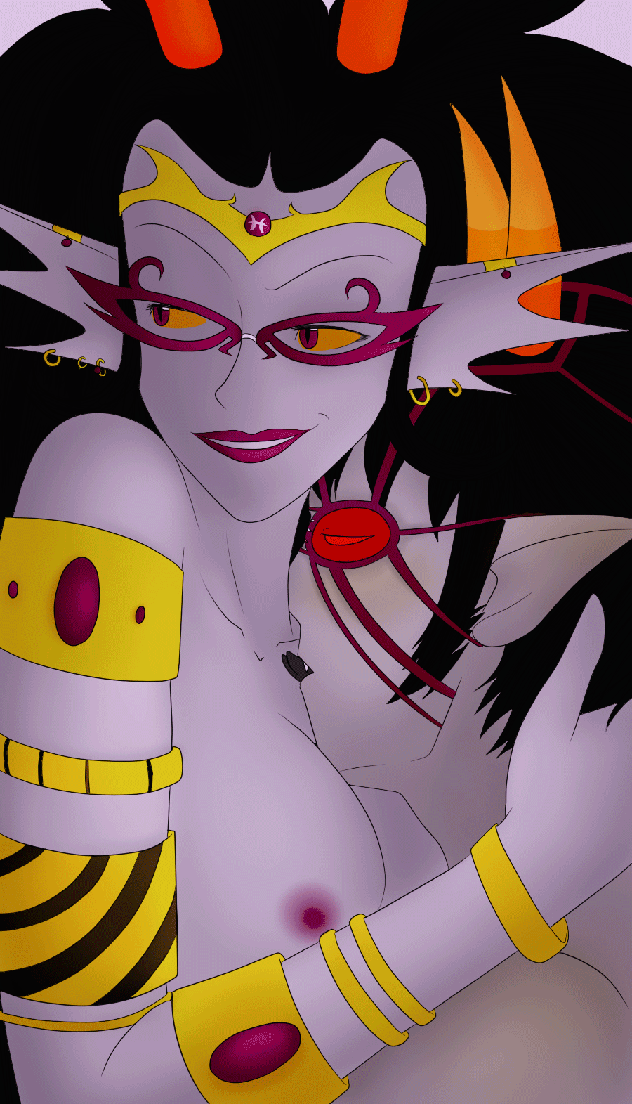 k3nnyn3v, original, commission, highres, 1boy, 1girl, ass, black hair, black shirt, blush, border, borrowed character, breasts, extra eyes, facial hair, glasses, grabbing another's ass, gradient background, grey background, groping, large breasts, lifting person, long hair, outside border, red eyes, shirt, sideboob, socks, stubble, white border, white socks