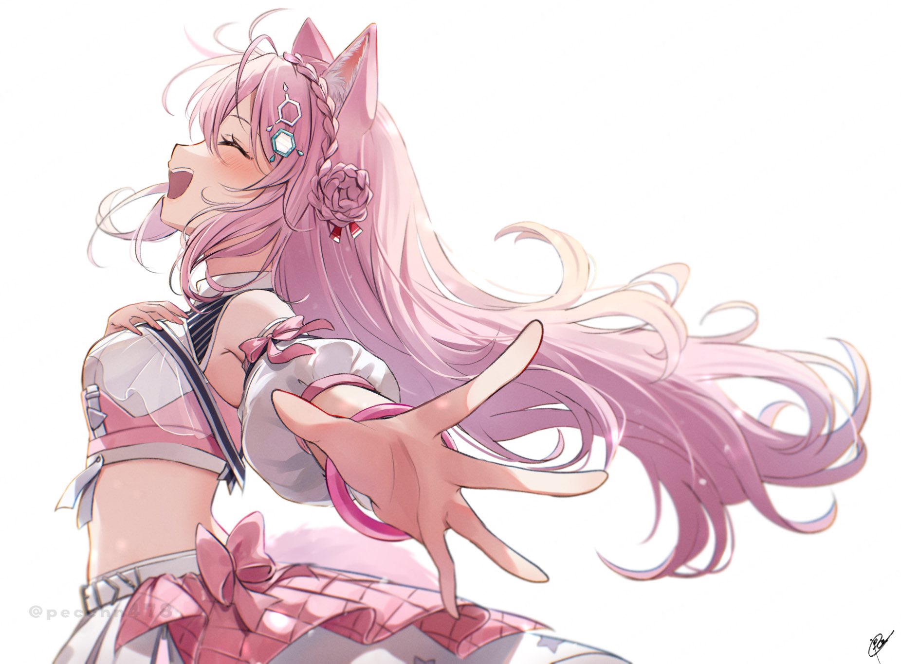 :d1girlanimal ear fluffanimal earsantenna hairbraidbraided bunclosed eyescollared shirtcropped shirtcrown braiddetached sleevesfloating hairfrom sidehair bunhand on own chesthexagon hair ornamenthololive idol uniform (color rise)idol clotheslong hairofficial alternate costumeopen mouthoutstretched armpink hairpink shirtpink tailpuffy detached sleevespuffy short sleevespuffy sleevesshirtshort sleevessimple backgroundsingle detached sleeveskirtsmilesolotailteethupper teeth onlyvery long hairvirtual youtuberwhite backgroundwhite shirtwhite skirtwolf earswolf girlwolf tail