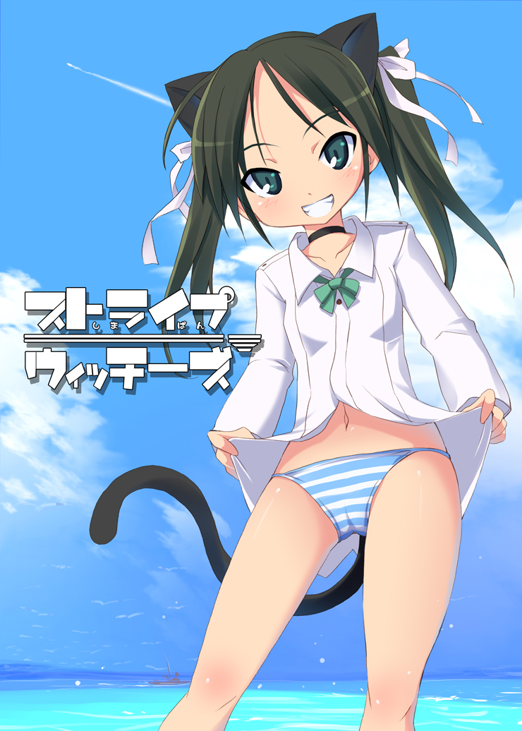 00s1girlanimal earsblushcat earscat tailfemale focusgreen eyesgreen hairlolilong hairmatching hair/eyesno pantspantiessolostriped clothesstriped pantiestailtwintailsunderwear