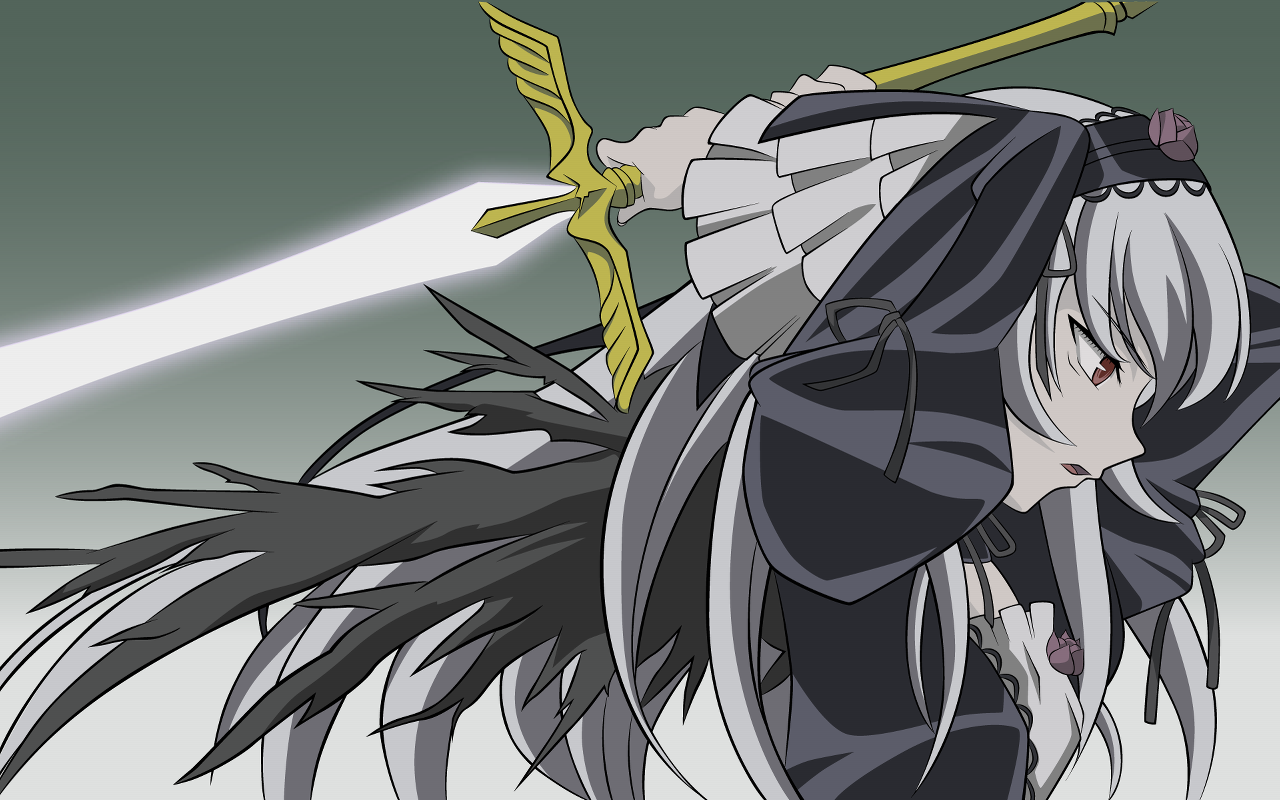 hide21find57, doodle sensei (blue archive), sensei (blue archive), suzumi (blue archive), blue archive, absurdres, commentary request, highres, translation request, 1boy, 1girl, black background, black shoes, black thighhighs, bow, closed mouth, cropped jacket, feathered wings, feathers, flashbang, ginkgo leaf, grey jacket, grey skirt, gun, head wings, jacket, layered sleeves, leaf, loafers, long hair, long sleeves, looking at viewer, mole, mole under eye, open clothes, open jacket, pleated skirt, red bow, red eyes, rifle, shirt, shoes, short over long sleeves, short sleeves, sig mcx, single head wing, skirt, smile, solo focus, standing, standing on one leg, thighhighs, very long hair, weapon, white feathers, white shirt, white wings, wings