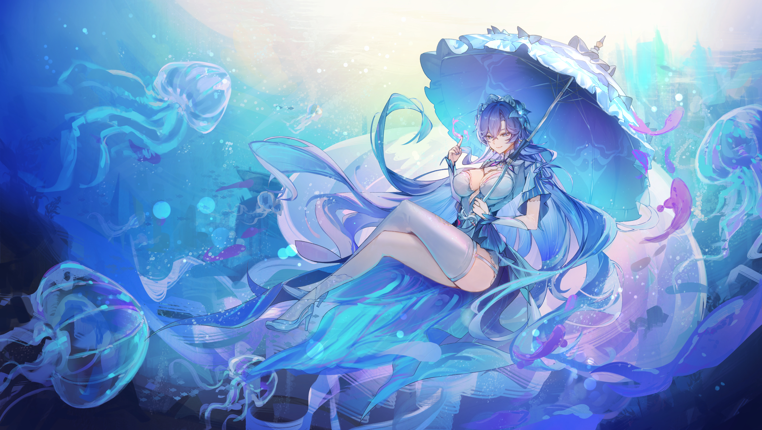 1girlasymmetrical legwearblue eyesblue hairblue umbrellabreastscool coloredcrossed legsdressfacial markfishflowerhair flowerhair ornamentheaddresshigh heelsholdingholding umbrellajellyfishlarge breastslong hairlooking at viewermark under eyeparasolsmilesolothighhighsumbrellaumbrella over shoulderunderwateruneven legwearvery long hairwhite dresswhite thighhighs