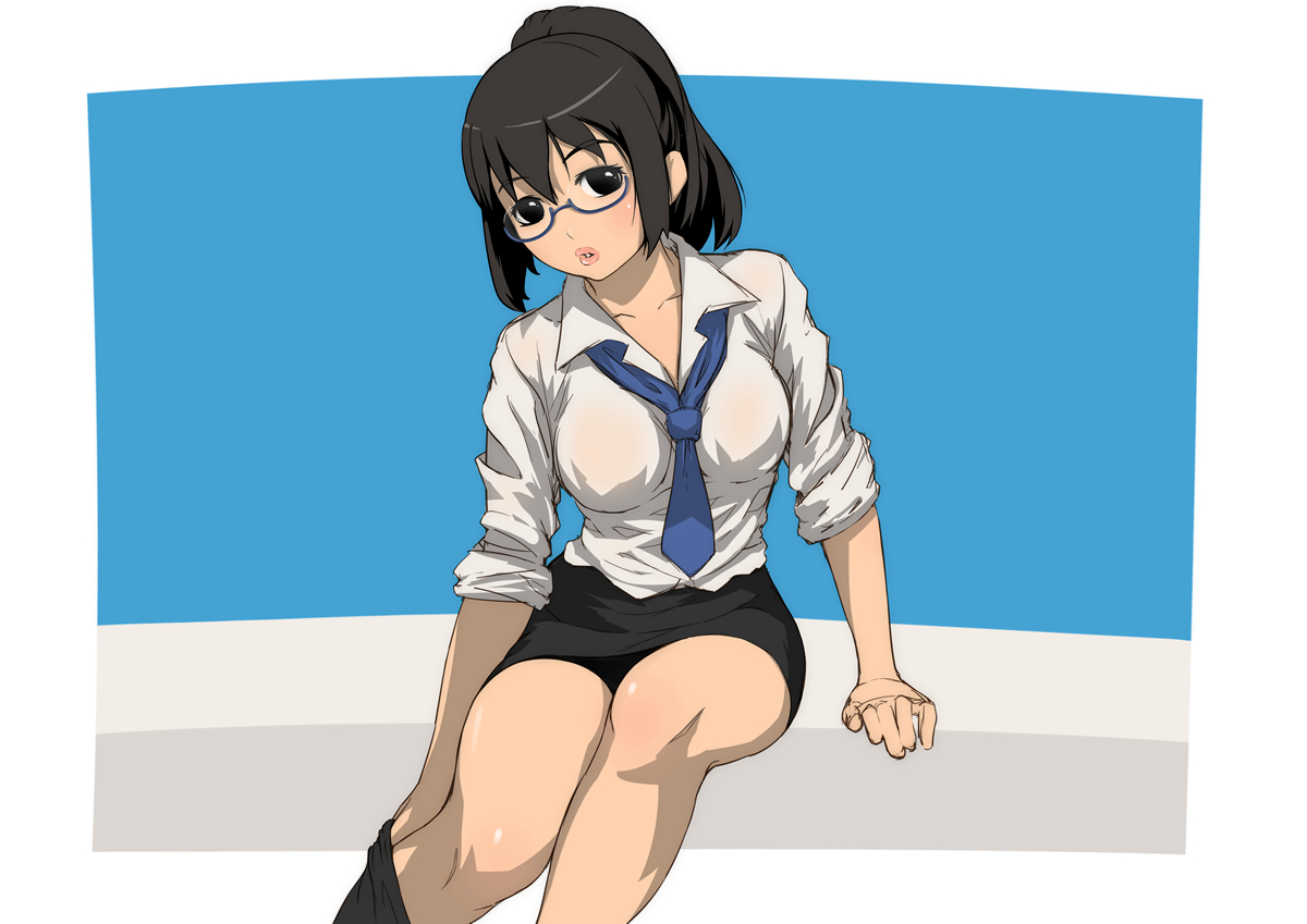 1girlblack hairbrown eyesclothes pullfemale focusglassesnecktiepantyhosepantyhose pullpencil skirtshirtskirtsleeves rolled upsolo