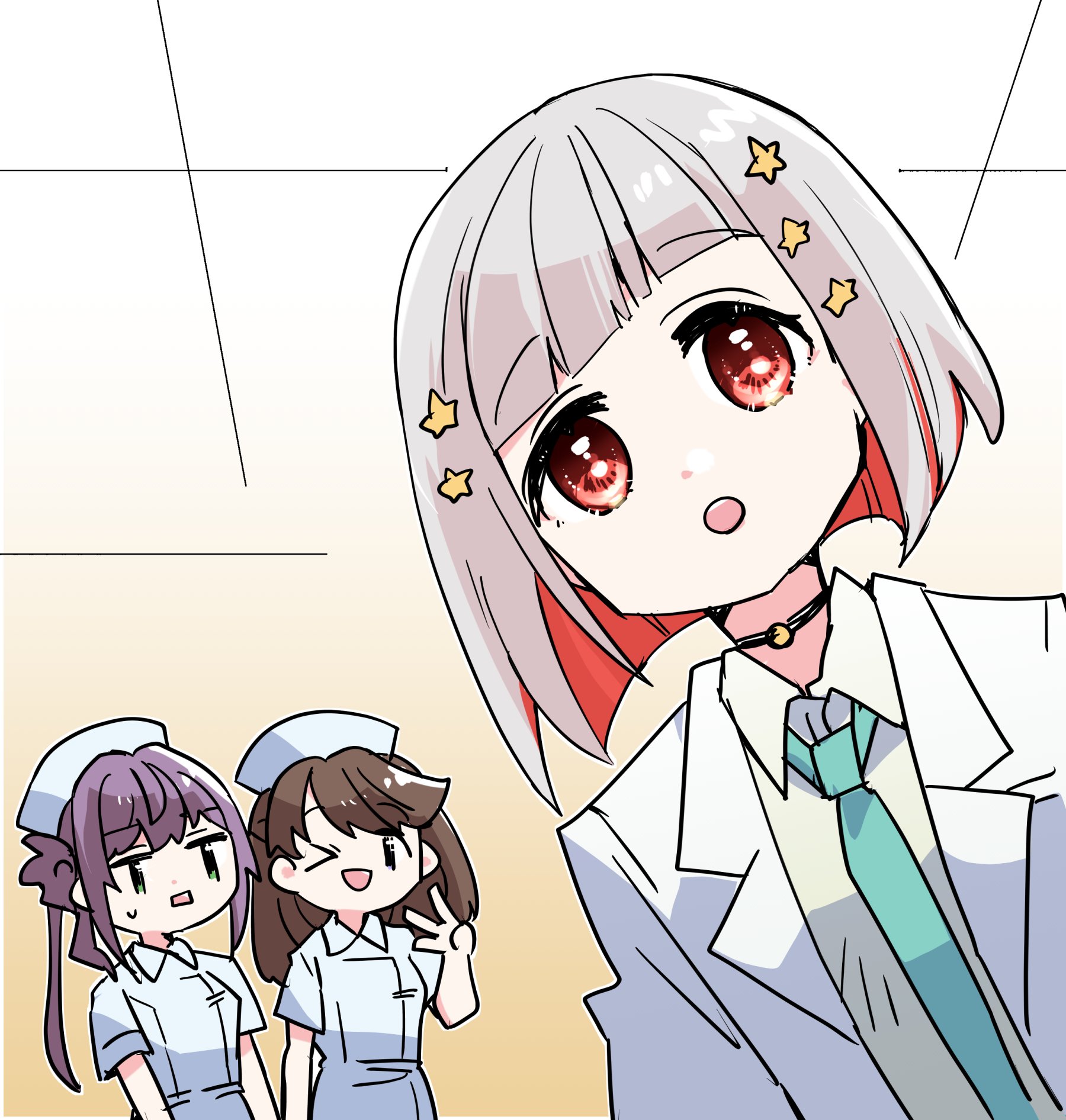 :d:o3girlsalternate costumeaqua neckerchiefblack chokerbrown hairchokercollared shirtcolored inner hairdoctordressgradient backgroundgreen eyesgrey hairhair ornamenthasu no daisankakuhatjacketlong hairlooking at viewermememulticolored hairmultiple girlsneckerchiefnine years in a coma (meme)nursenurse capo-ringo-ring chokerone eye closedopen mouthpurple eyespurple hairred eyesred hairshirtside ponytailsidelockssmilestar (symbol)star hair ornamentstreaked hairtwo side upvirtual youtuberwhite dresswhite jacketwhite shirtyellow background