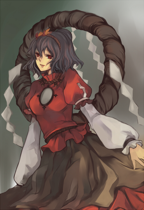 1girlbroochcowboy shotdressfemale focusgemhair ornamenthairbandjewelrylayered sleevesleaf hair ornamentlong sleeveslooking at viewermirrorpuffy short sleevespuffy sleevespurple hairred dressred eyesropeshideshimenawashort hairshort hair with long locksshort over long sleevesshort sleevesskirtsolo