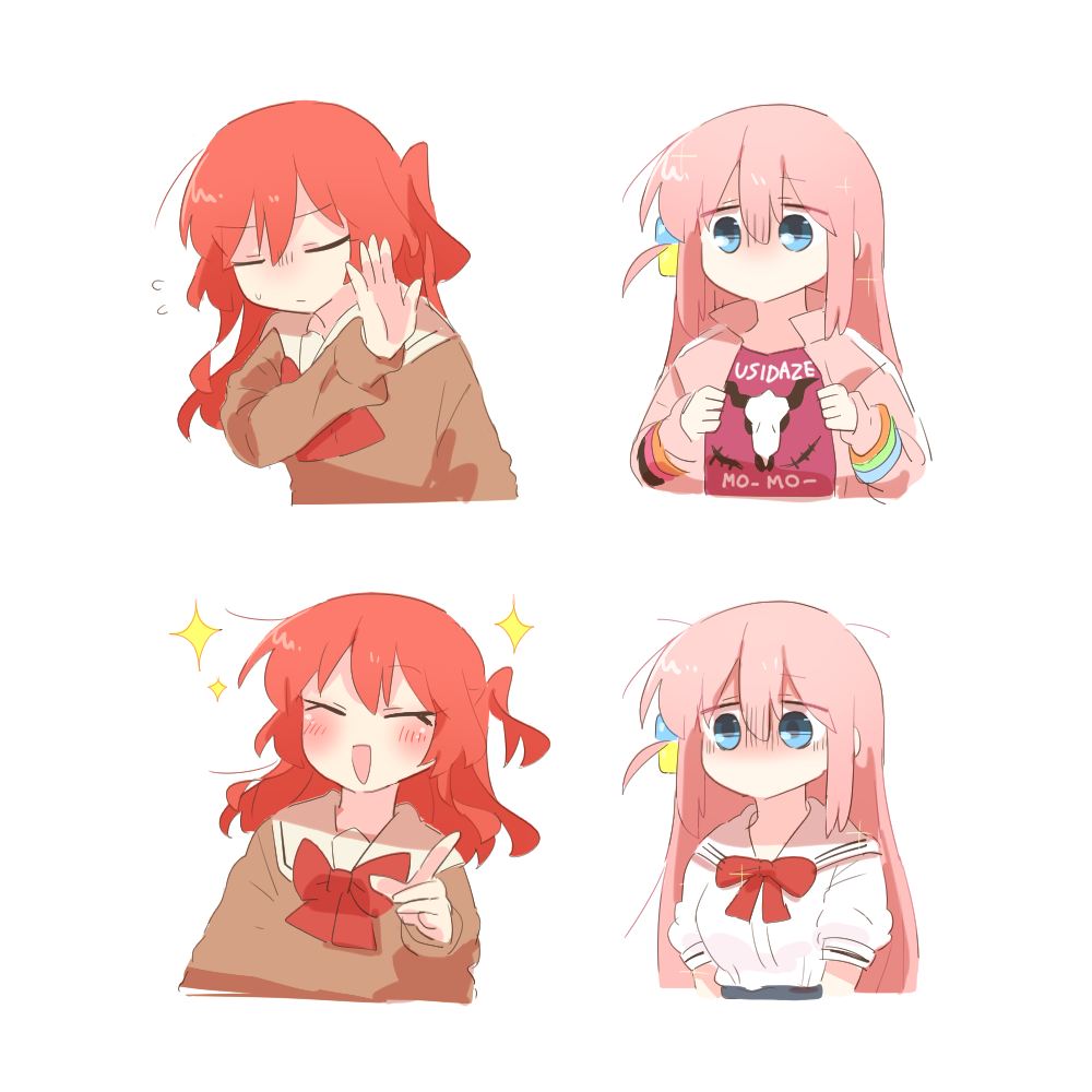 :d1boy2girlsblue eyesbowbowtiebrown shirtclosed eyesclosed mouthcropped torsocube hair ornamentdrakeposting (meme)hair between eyeshair ornamentjacketlong hairlong sleevesmememultiple girlsno (gesture)no mouthone side upopen clothesopen jacketopen mouthpink hairpink jacketpink shirtprint shirtred bowred bowtiered hairsailor collarschool uniformshirtshort sleevesshuka high school uniformsidelockssimple backgroundsmilesparklewhite backgroundwhite sailor collarwhite shirt